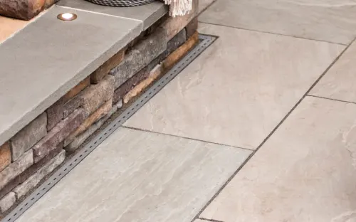 Unless built to be permeable, hardscapes must include drains to catch water. Without drains, you are likely to have pooling water, staining, and failures in the joint grout and foundation.
