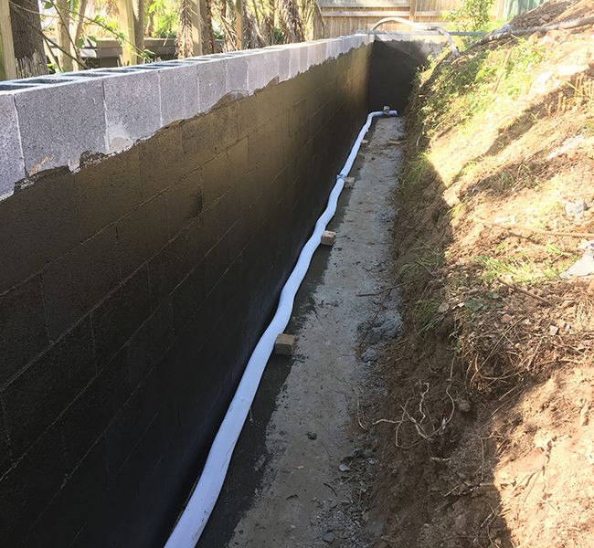 When building walls composed of concrete cinder blocks, it's essential to waterproof any portion of the structure that is below-grade. When this is not done, built-up moisture deteriorates the cinderblocks, causing the wall to crumble.