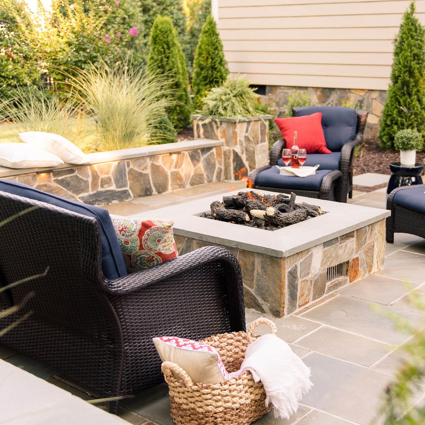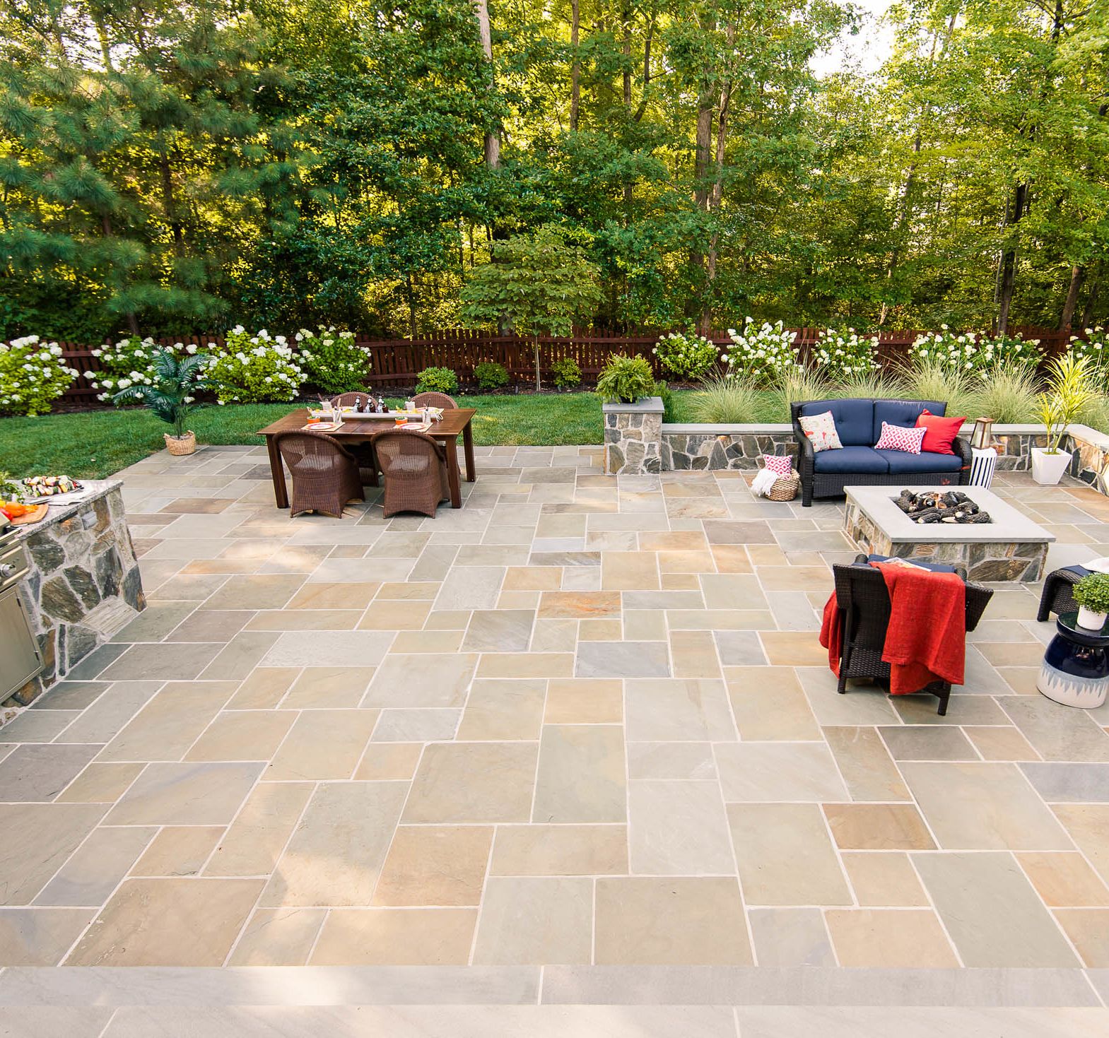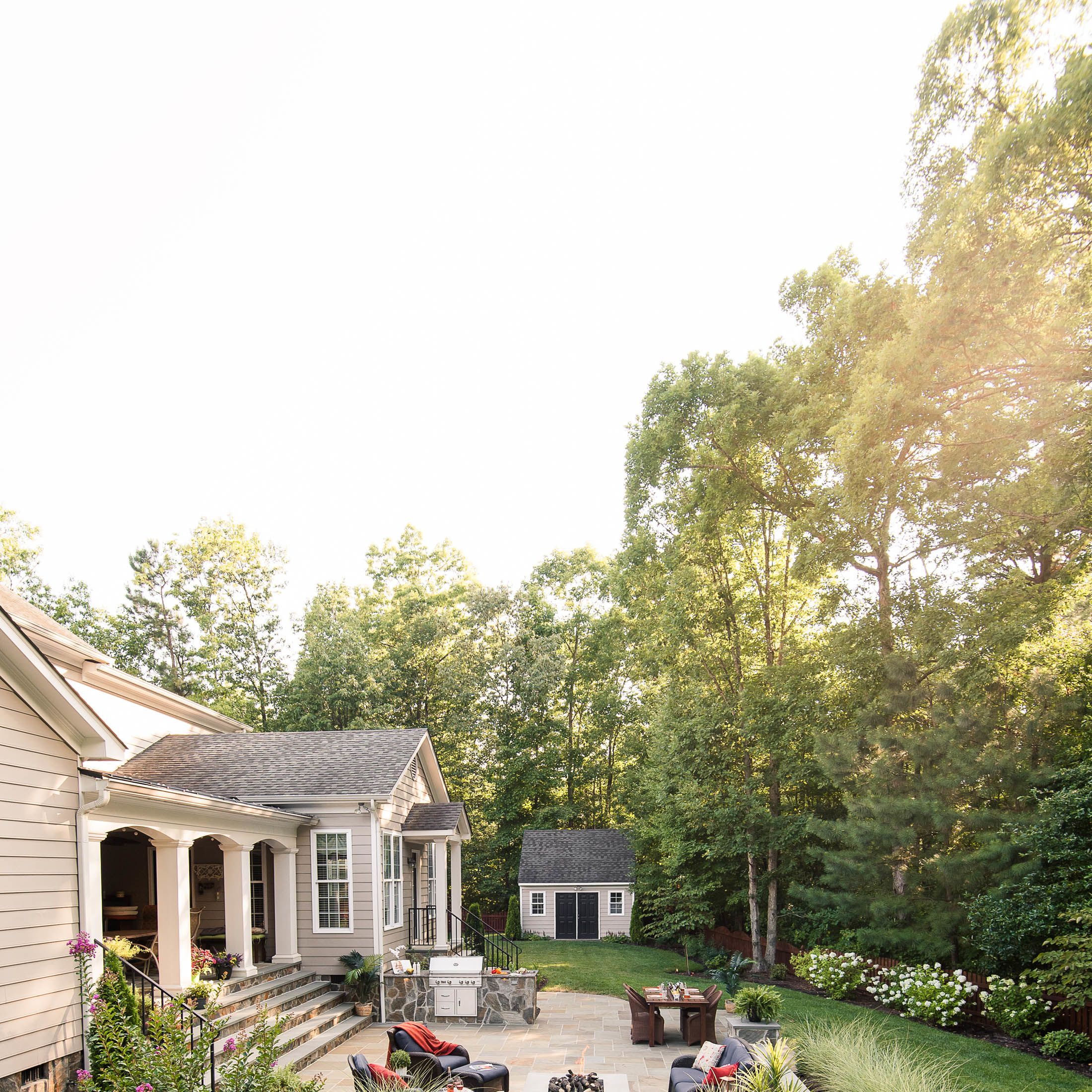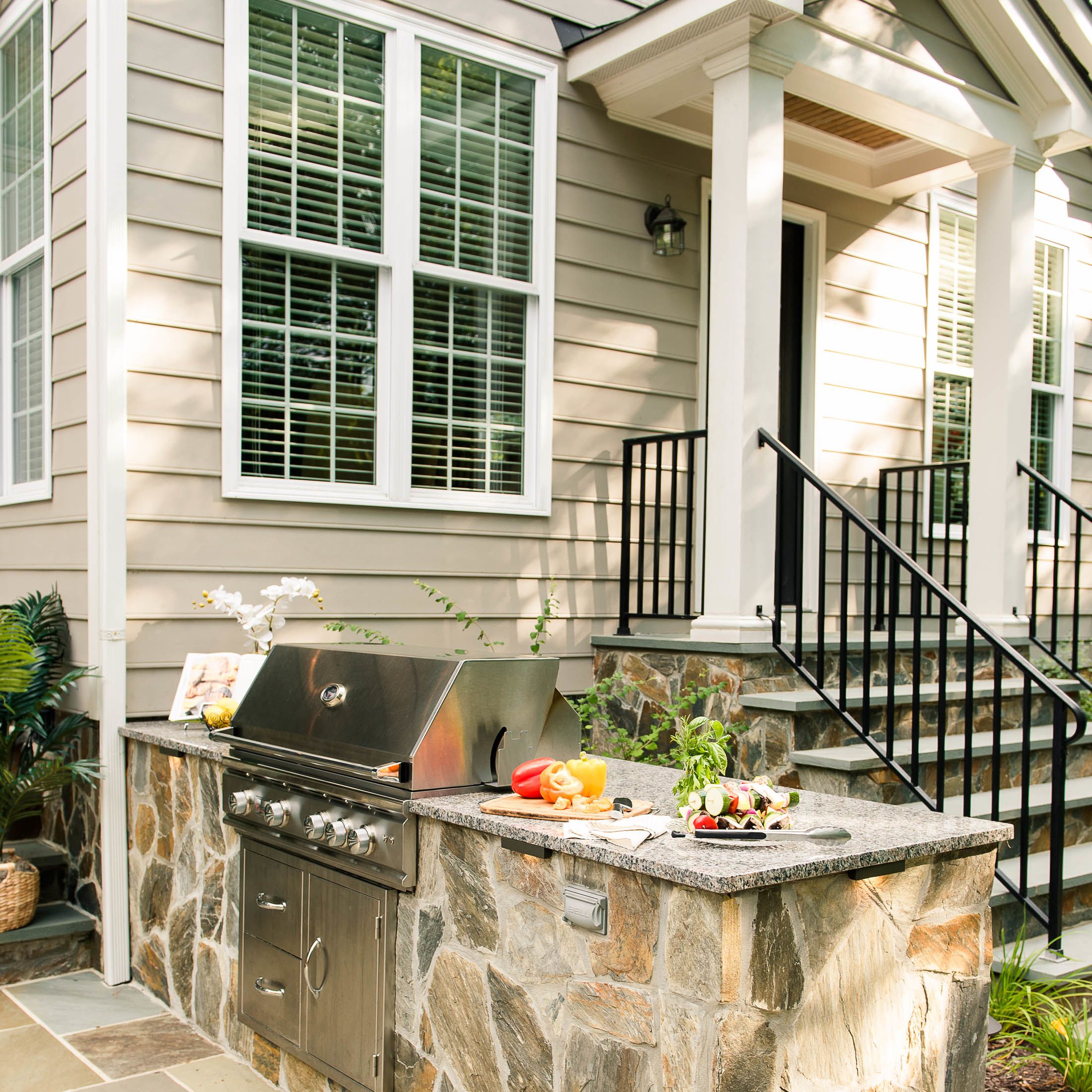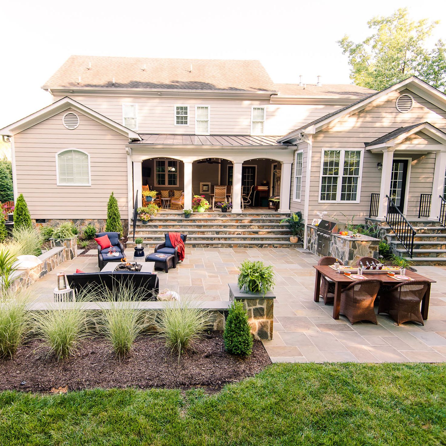 With their kids grown and out of the house, this hardworking couple was looking to transform their blank backyard into something special. The final space is a stunning extension of the house and features a mortared-bluestone patio, grill island, gas fire pit, sitting walls and outdoor lighting. The project also includes comprehensive landscaping of the front and backyard.