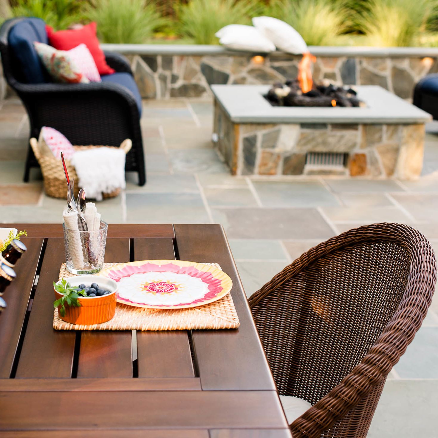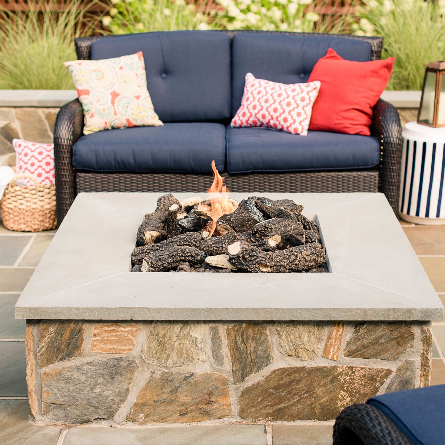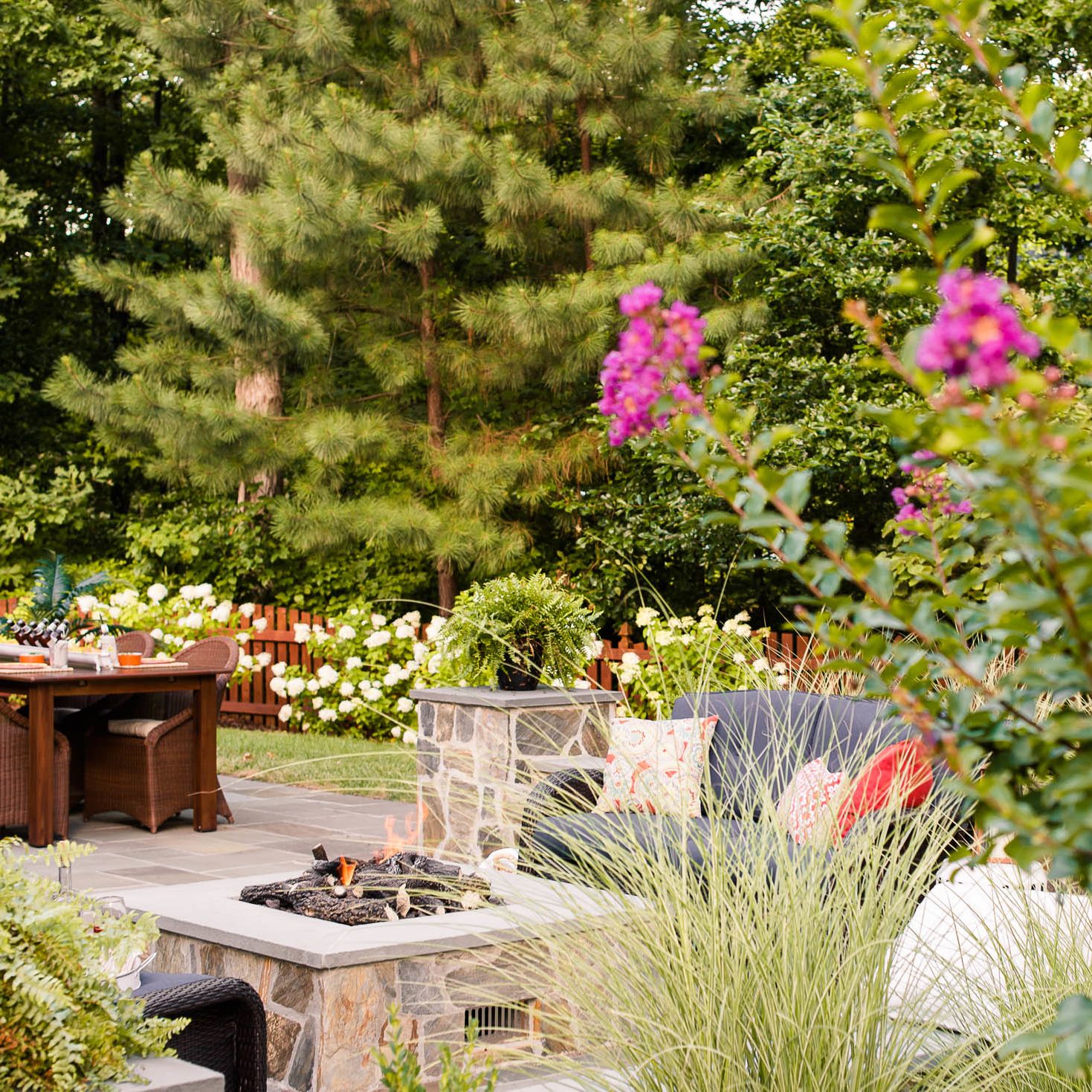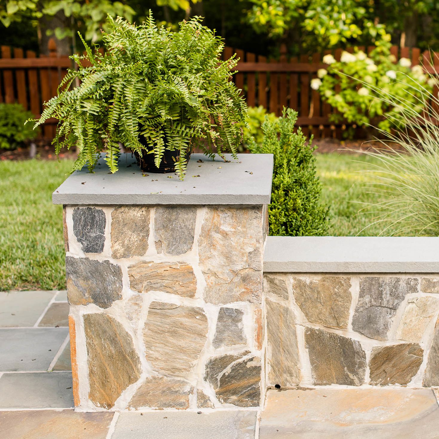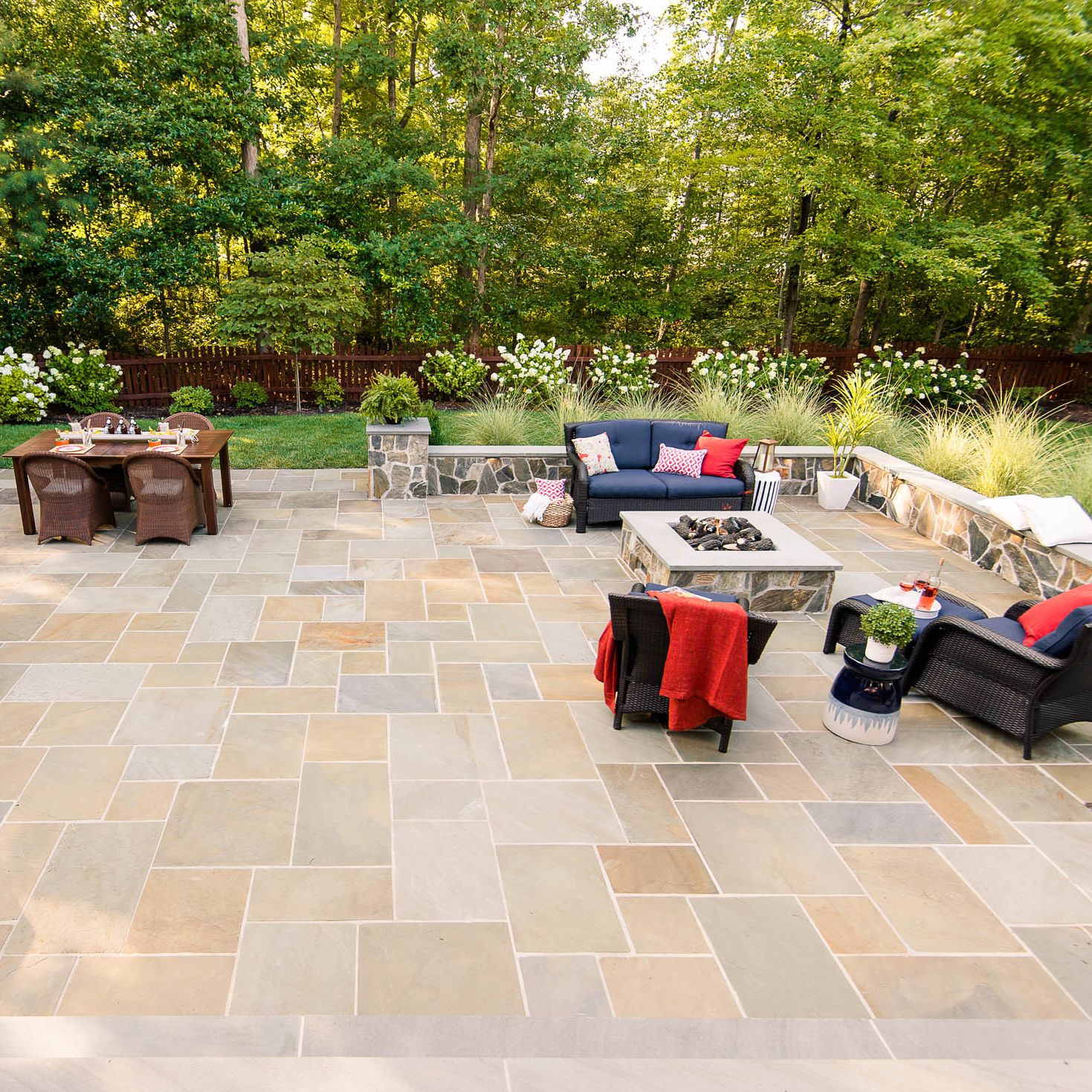 With their kids grown and out of the house, this hardworking couple was looking to transform their blank backyard into something special. The final space is a stunning extension of the house and features a mortared-bluestone patio, grill island, gas fire pit, sitting walls and outdoor lighting. The project also includes comprehensive landscaping of the front and backyard.