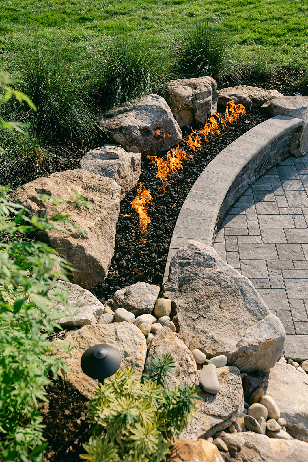 The homeowners initially considered standard options—linear fire pits, circular bowls—but ultimately chose something entirely custom: curved burners sculpted specifically for their space. Once they saw the concept, there was no going back.