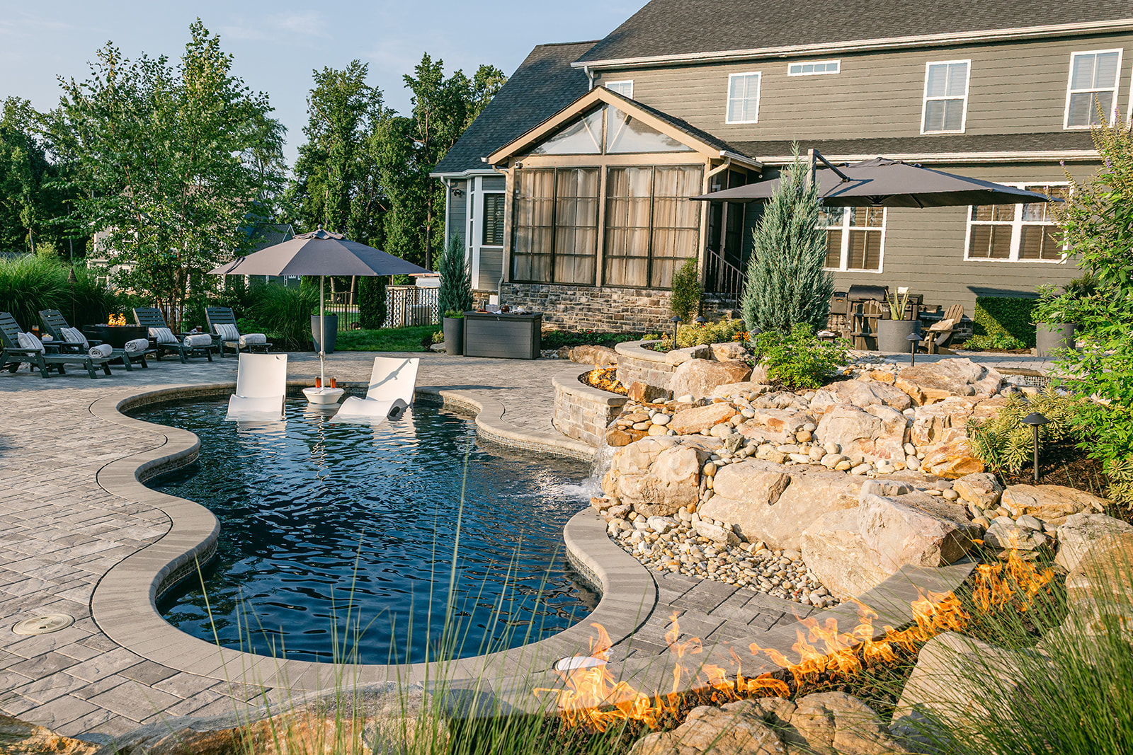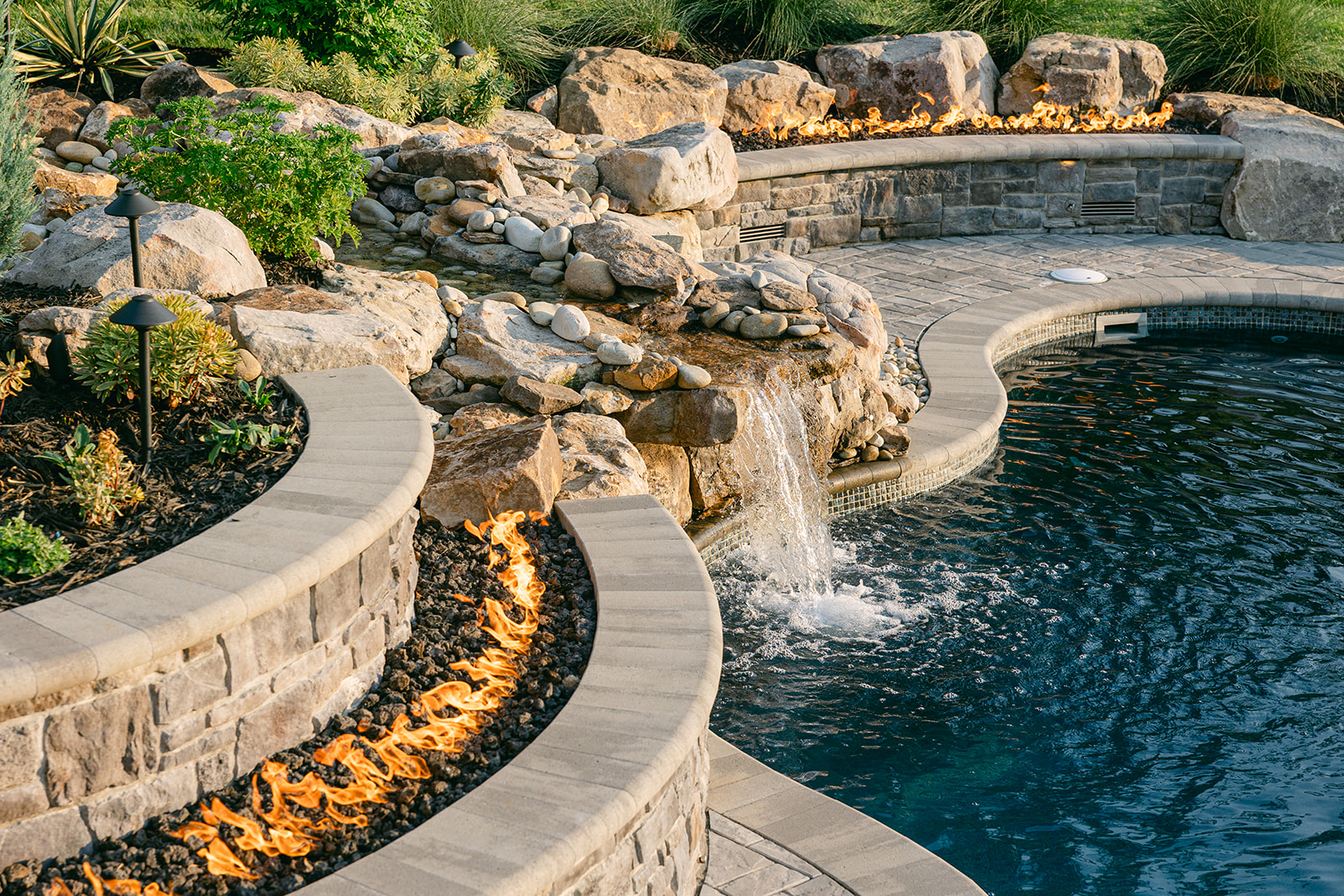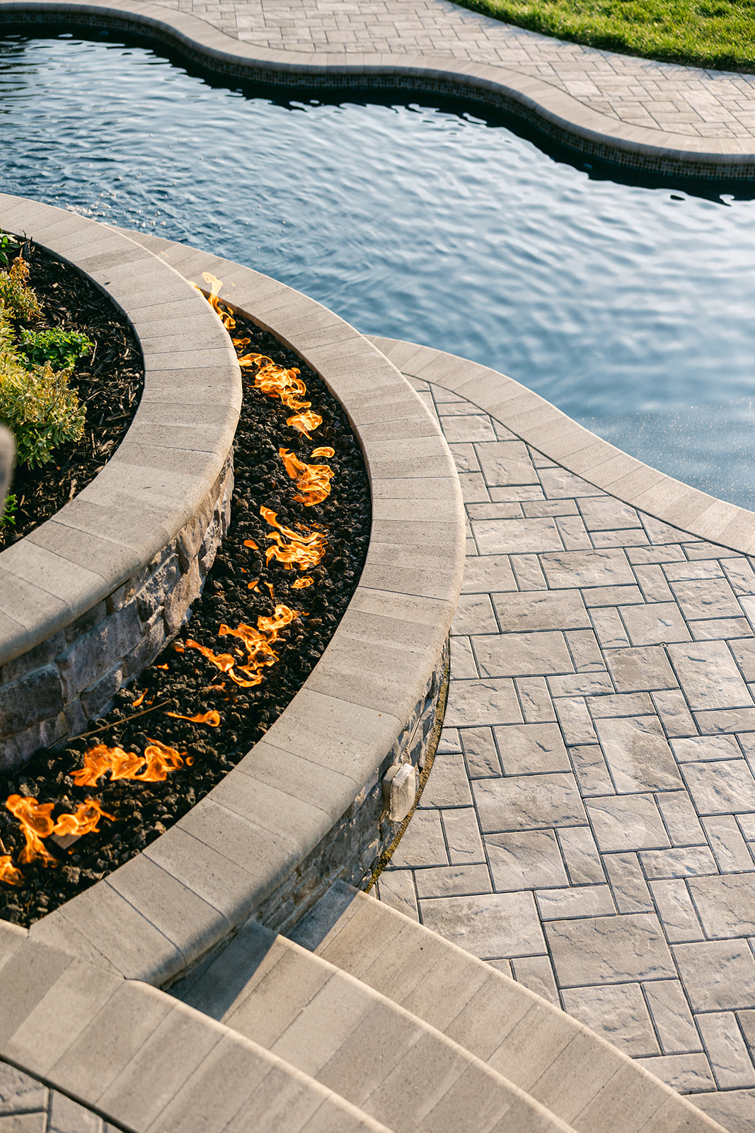 By shaping the burners to follow the exact curves of the pool and patio, the flames feel like an extension of the design rather than a separate installation. Their movement complements the flowing water and lush plantings, creating a dynamic visual rhythm that changes with every perspective.