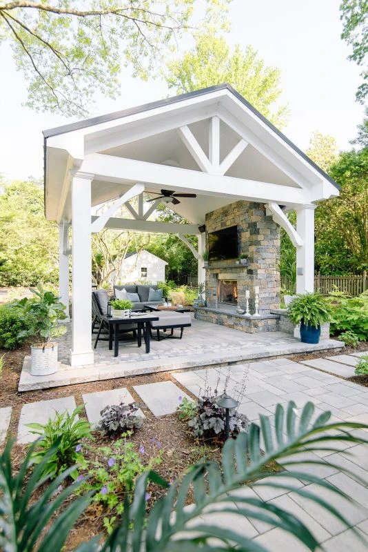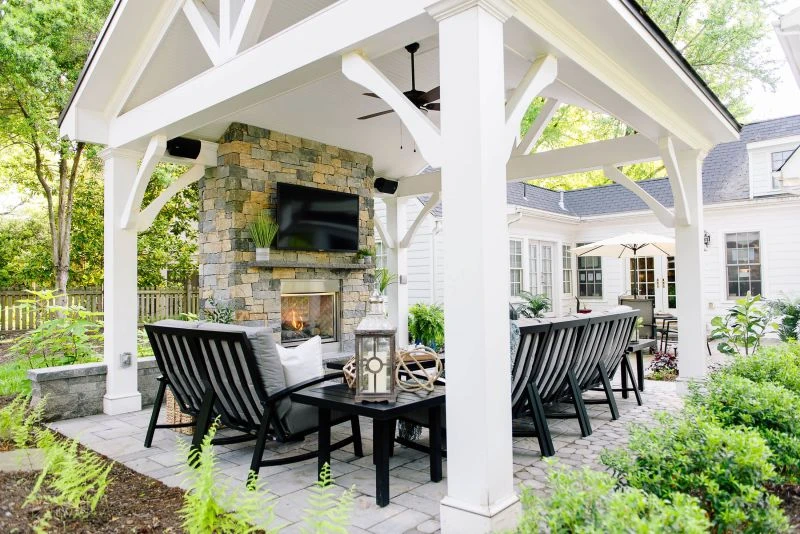 Fully furnished back patio with fireplace and TV under white pavilion