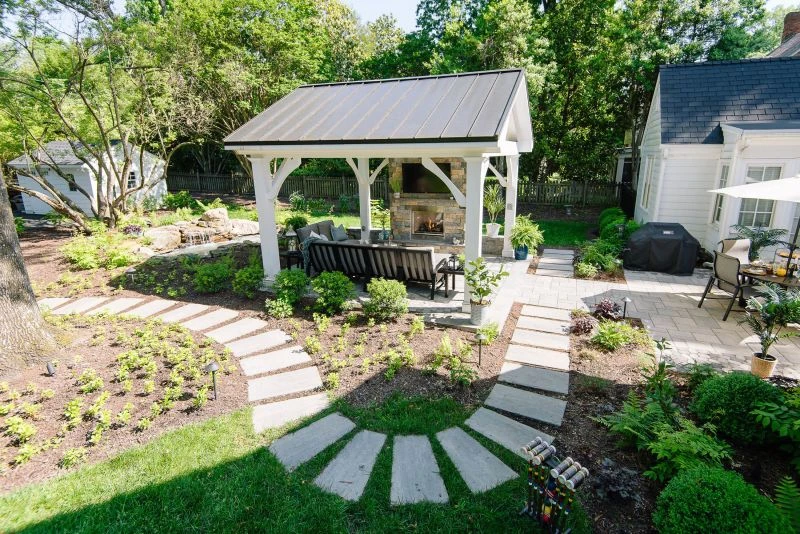 light grey natural Stepping stone walkway through the backyard and around the pavilion