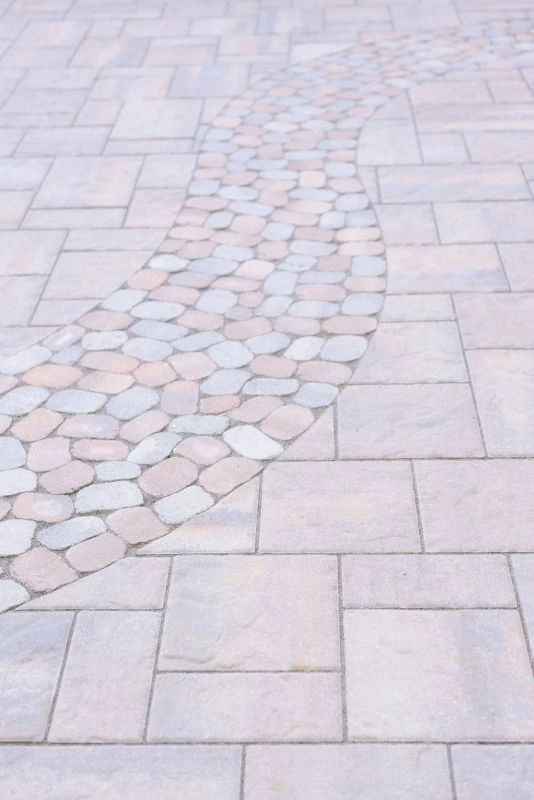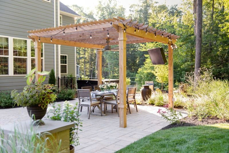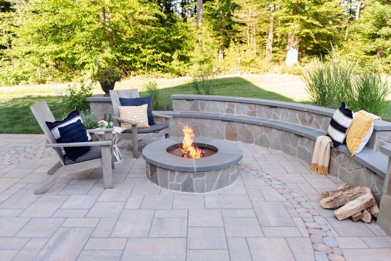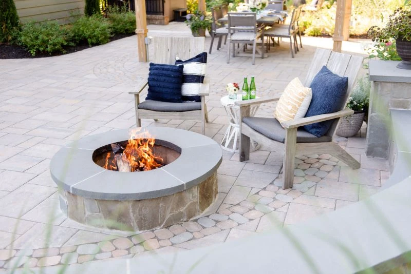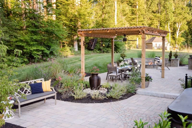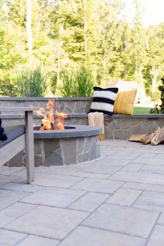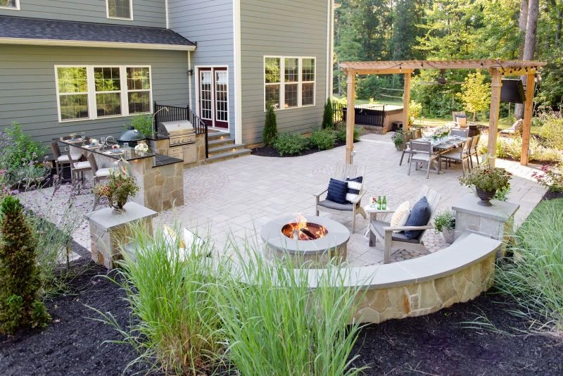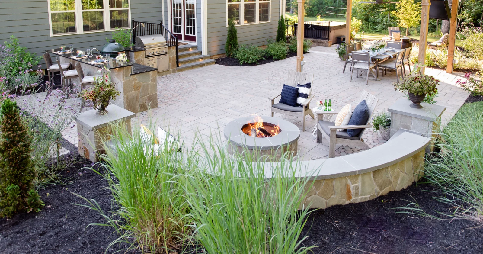 This wonderful client came to Outdoor Dreams looking for an area to entertain family and friends. Their outdoor living space includes a wood-burning fire pit, pergola-covered dining area, masonry stairs, bench-style sitting walls, hot tub, television, and an expansive outdoor kitchen. The patio is composed of BLU 60 slabs from Techo-Bloc and includes a unique inlay of Antika pavers. The masonry structures feature split face veneer using colonial wall stone. The expansive outdoor kitchen features a gas grill, egg smoker, grill lamp, sink, refrigerator, trash drawer, and bar-top seating. The hardscape structures are complemented by the expansive landscape and outdoor lighting. Whether entertaining a group or casual evening watching sports on the television, the homeowners use this space almost every day.