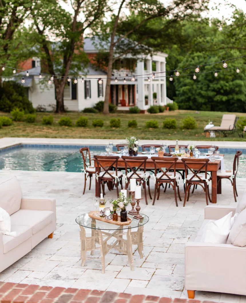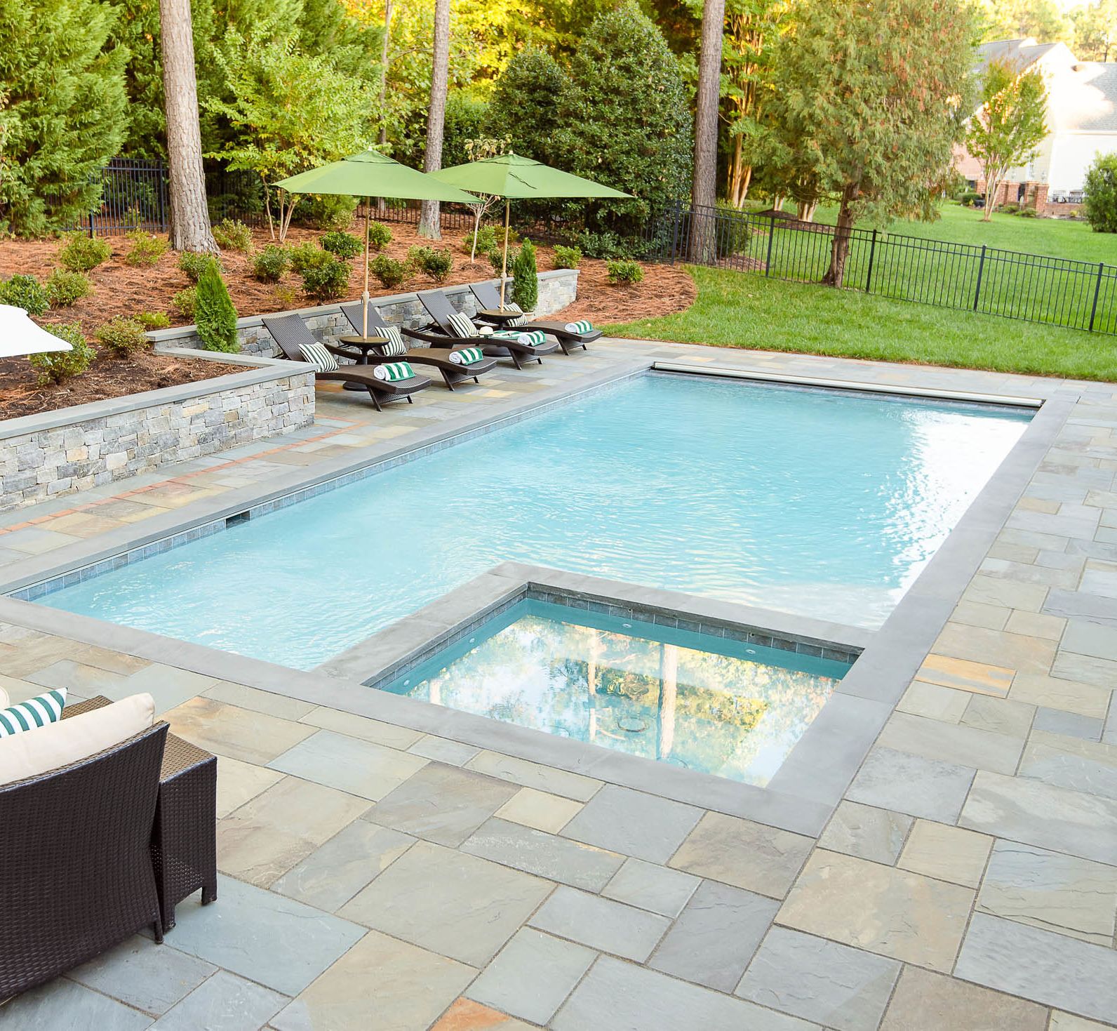The pictured poolscape is a great example of this approach. To match the architecture of this 1700s home, we used travertine and handmade brick. Travertine has a naturally aged look and a long history as a building material, dating back to ancient Roman times. The handmade brick, used for retaining walls wrapping the space, provides a historic look that blends beautifully with the house.