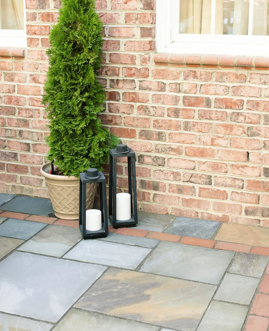In the pictured project, materials were chosen that both match and compliment the house. The main paver for this outdoor living space is variegated bluestone which beautifully compliments the all-brick home. The full-range color variegation of this bluestone offers auburn hues that match perfectly with the home's rose-colored brick. For additional cohesion, a simple inlay border of rose-colored brick pavers directly ties the house and outdoor living space together.