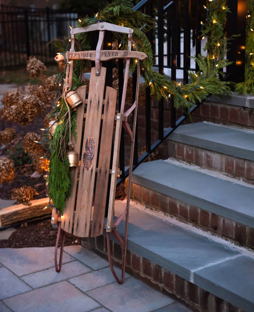 Make use of the old winter sporting equipment that's been collecting dust for years. Create a winter scene using a vintage sled, skates, or skies.