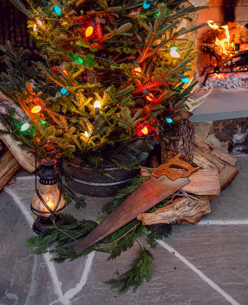 Along with vintage winter sporting equipment, consider incorporating vintage outdoor tools. As pictured, a simple saw at the base of tree, gives the look of a "fresh cut." An axe with a splitting wedge near a pile of firewood can also enhance a rustic, winter vibe.