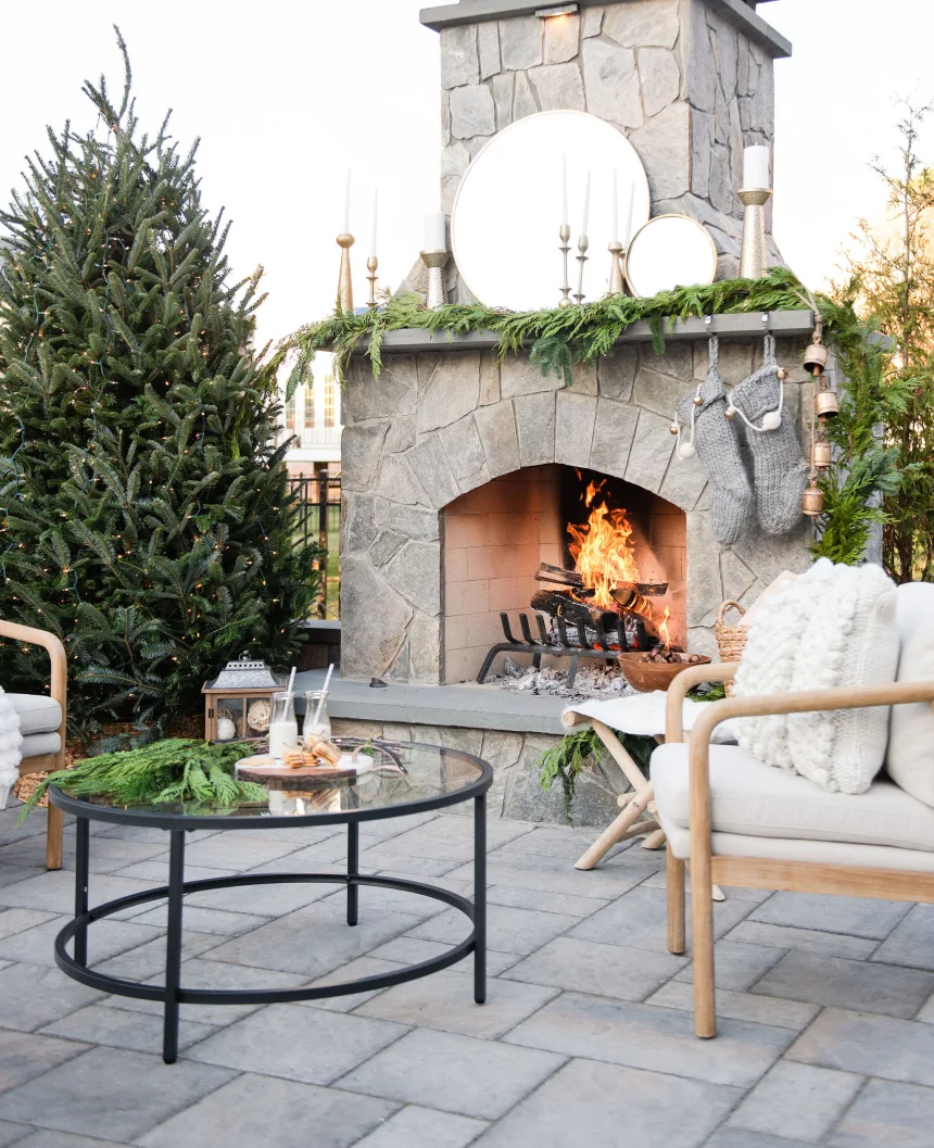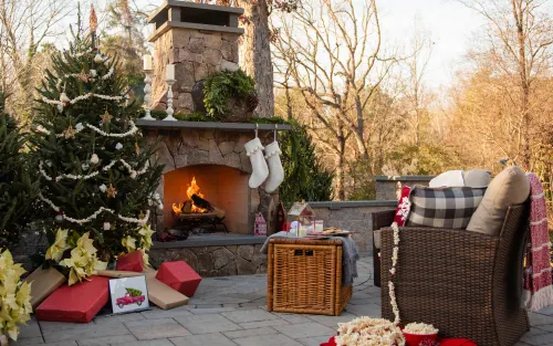 Our 2021 Holiday photoshoot delivers all of the holiday feels! From roasting chestnuts to sleigh bells to milk and cookies for Santa, we have set the scene for holiday magic and memories. The project features a Techo-Bloc paver patio, raised terrace, outdoor fireplace, and complementing landscaping and lighting.