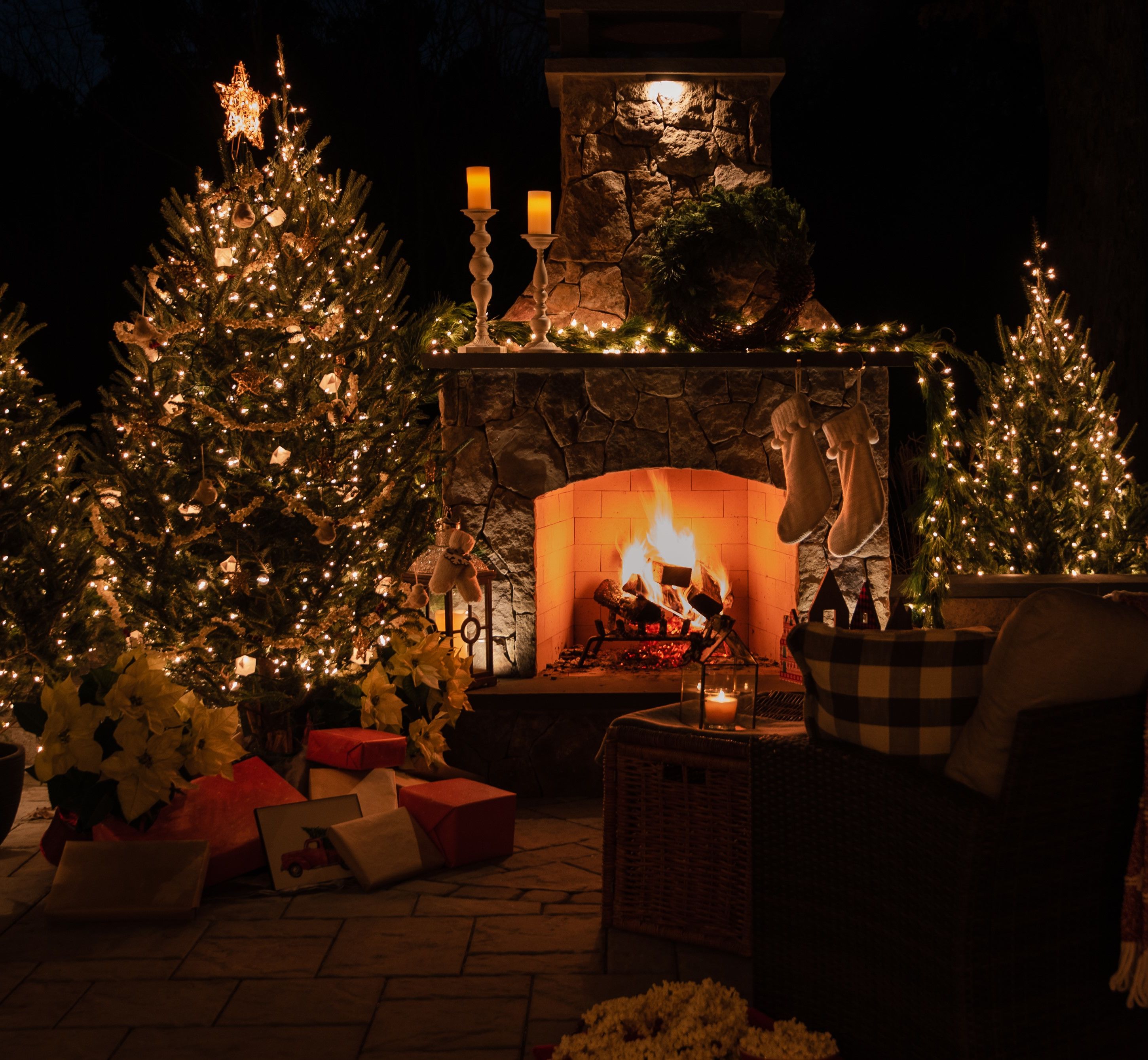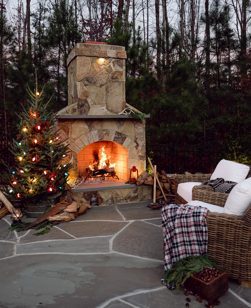 With a wooded backdrop, the 2022 Holiday Photoshoot features rustic elements and encourages holiday fun around the fire. Our holiday décor emphasizes vintage items and highlights everyday outdoor tools. Unlike years passed, all of the decor in these photos is outdoor rated. The rustic and vintage decor is meant to compliment the outdoor space that features stunning cedar woodworking, fieldstone boulders and veneer, irregular bluestone flagstone, and Unilock pavers.