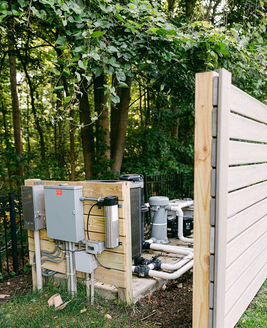To hide this pool equipment, we built a custom screen out of composite decking to match the deck we built as part of the project.