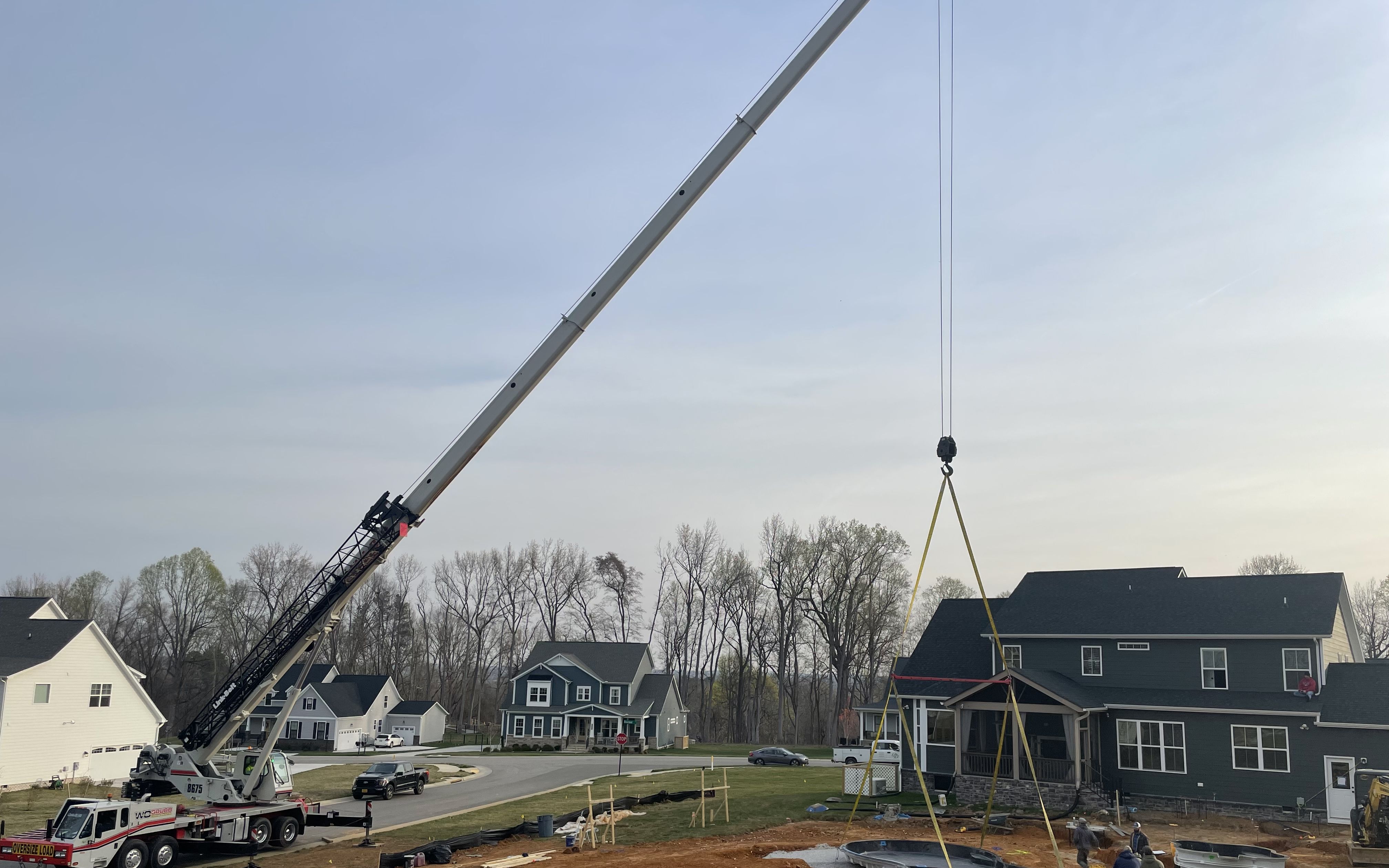 Even with easy access using smaller equipment, this pool is being set with a crane to ensure a smooth installation without excess movement that can cause cracking.