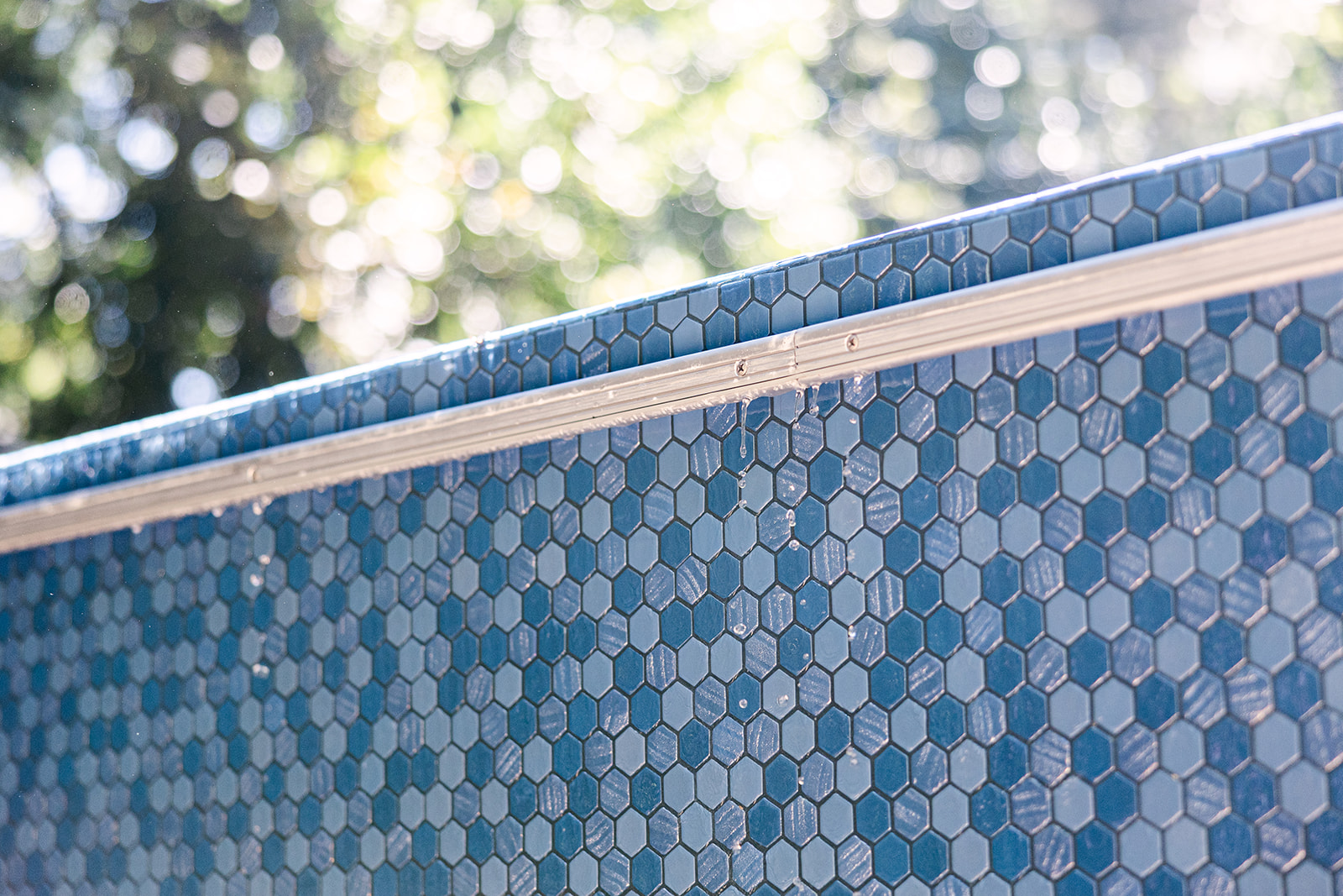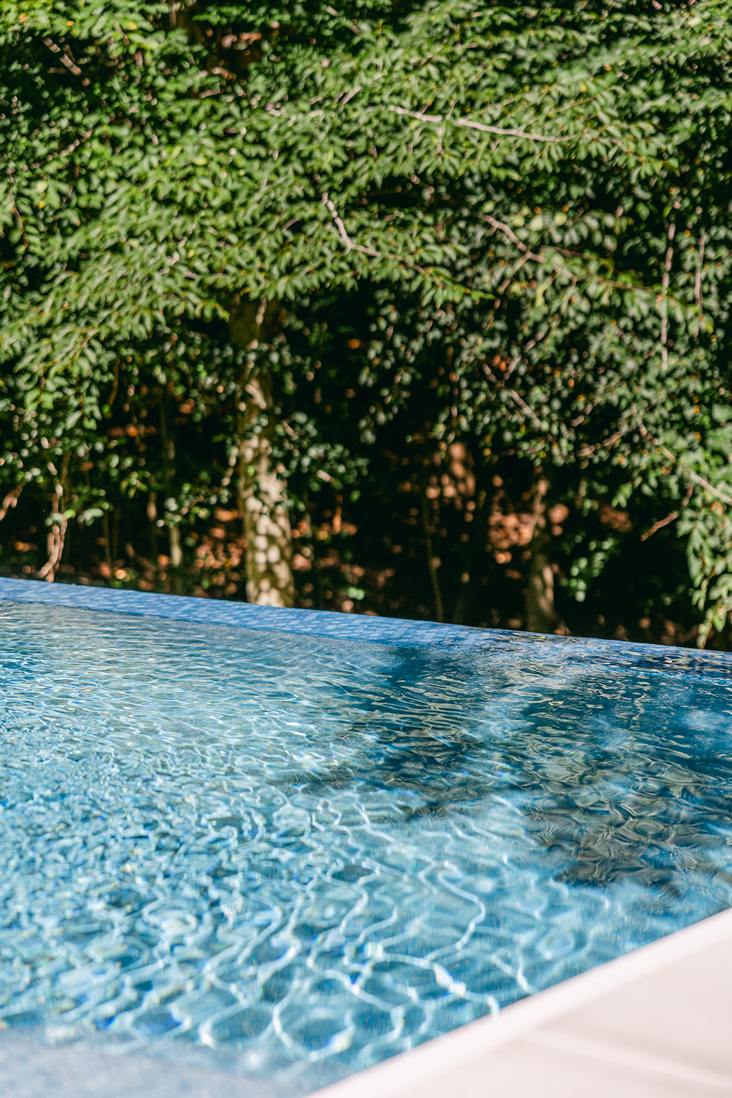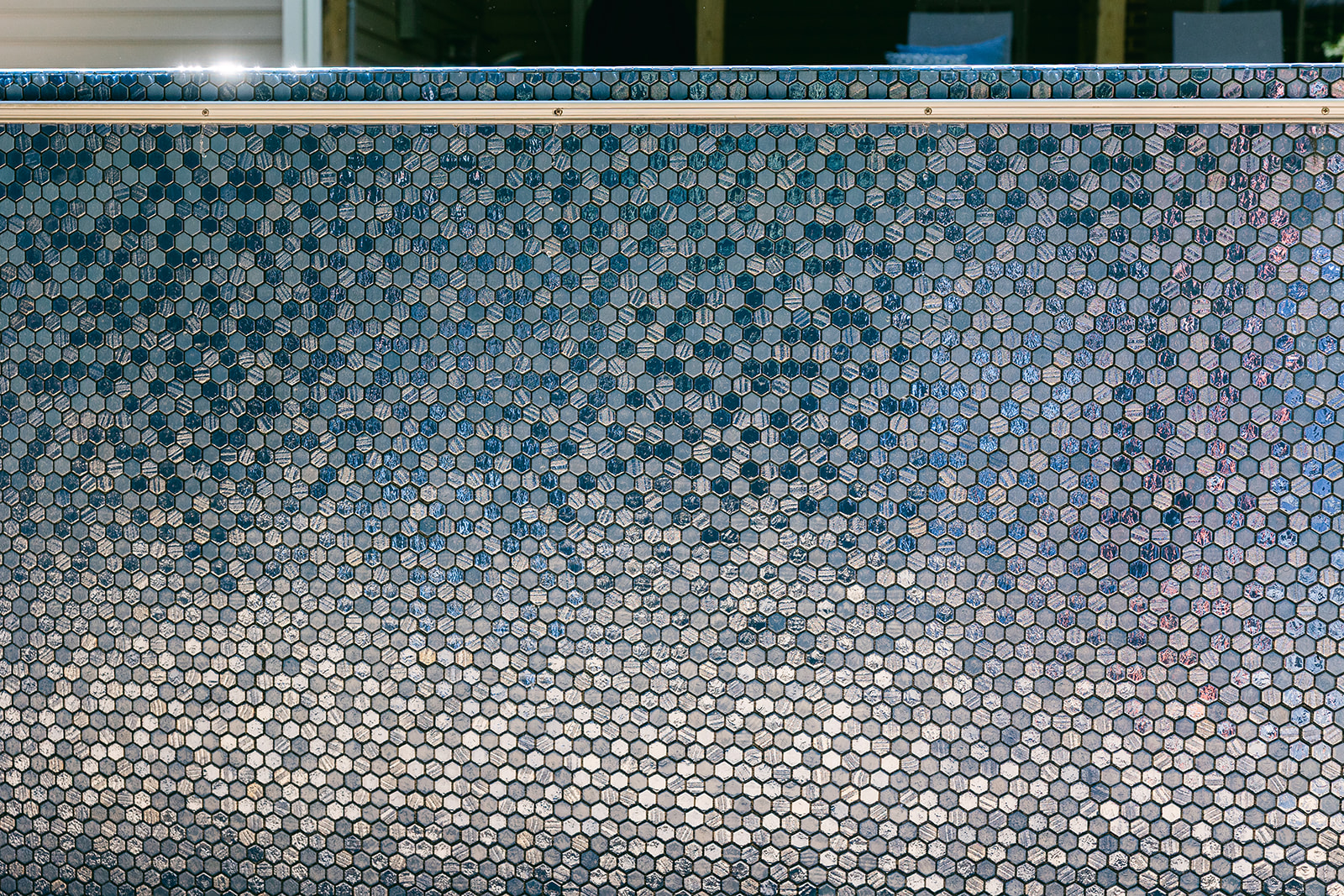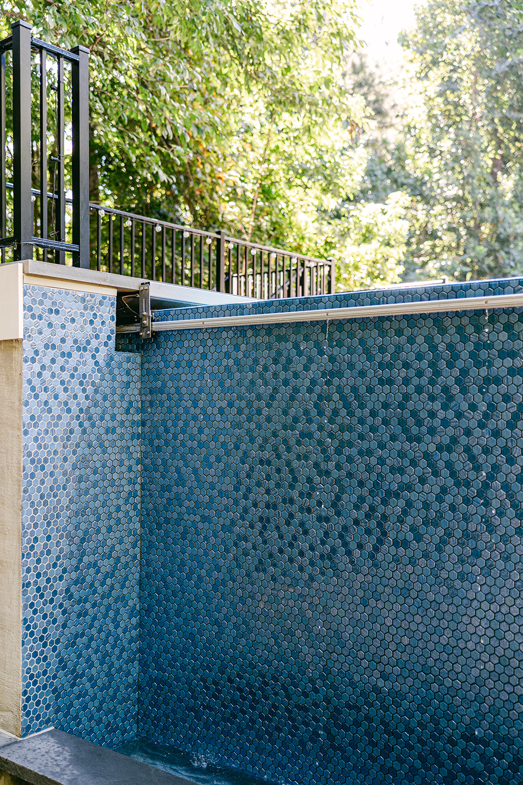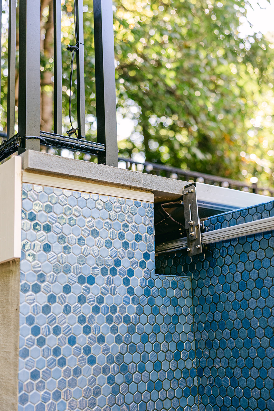 The pool’s finish is Primera Stone in Sapphire Treasure from Wet Edge Technologies, a polished interior surface that delivers rich blue tones and a smooth, glass-like texture. Complementing the finish is the stunning Sea Glass Cobalto Hexagon tile from NPT, a client-selected feature that adds a subtle touch of artistry and depth to the design.