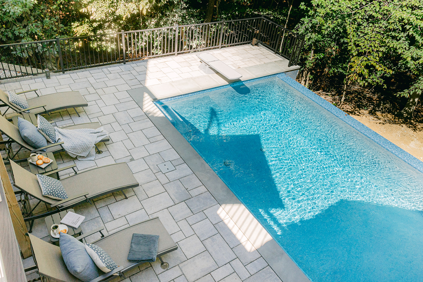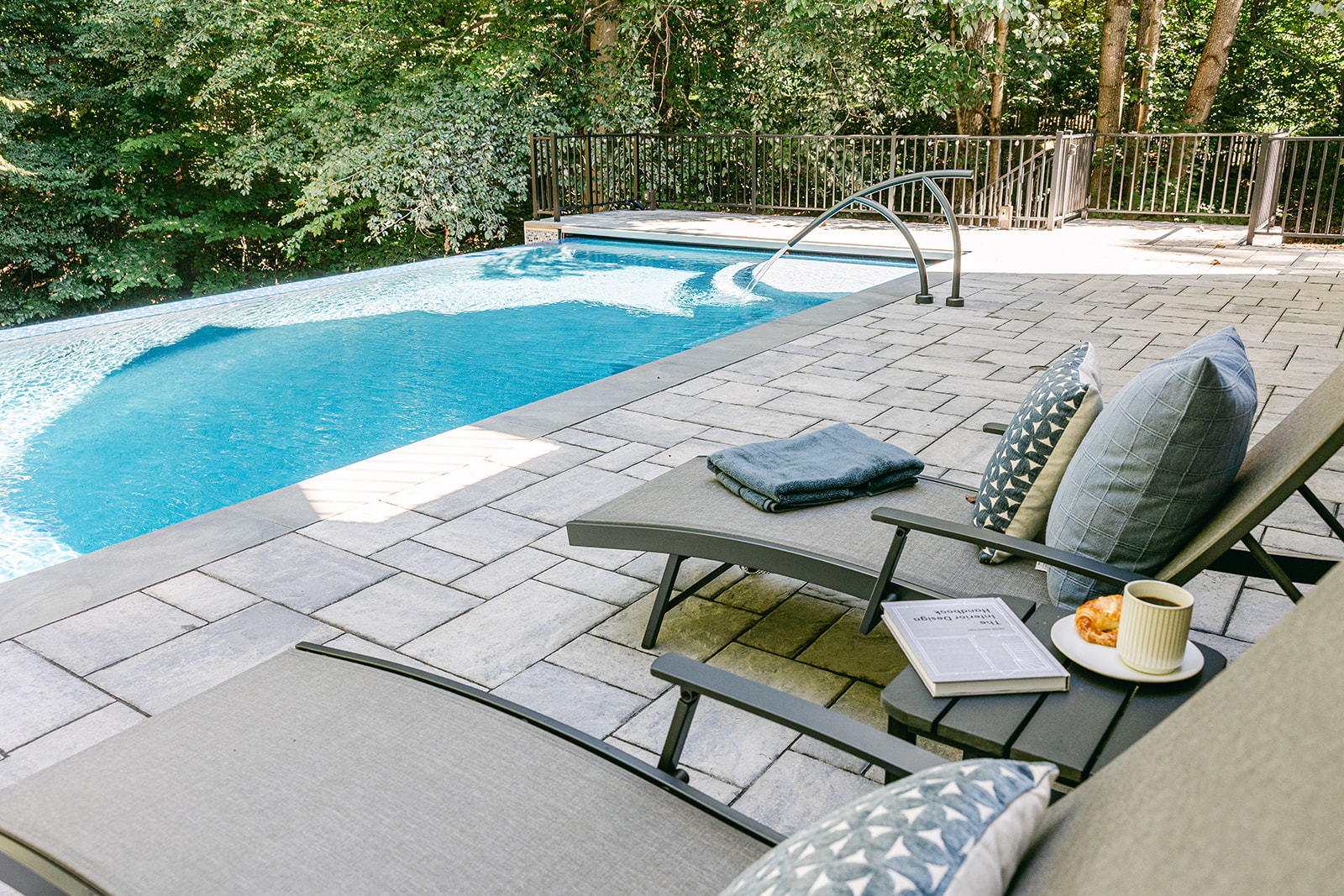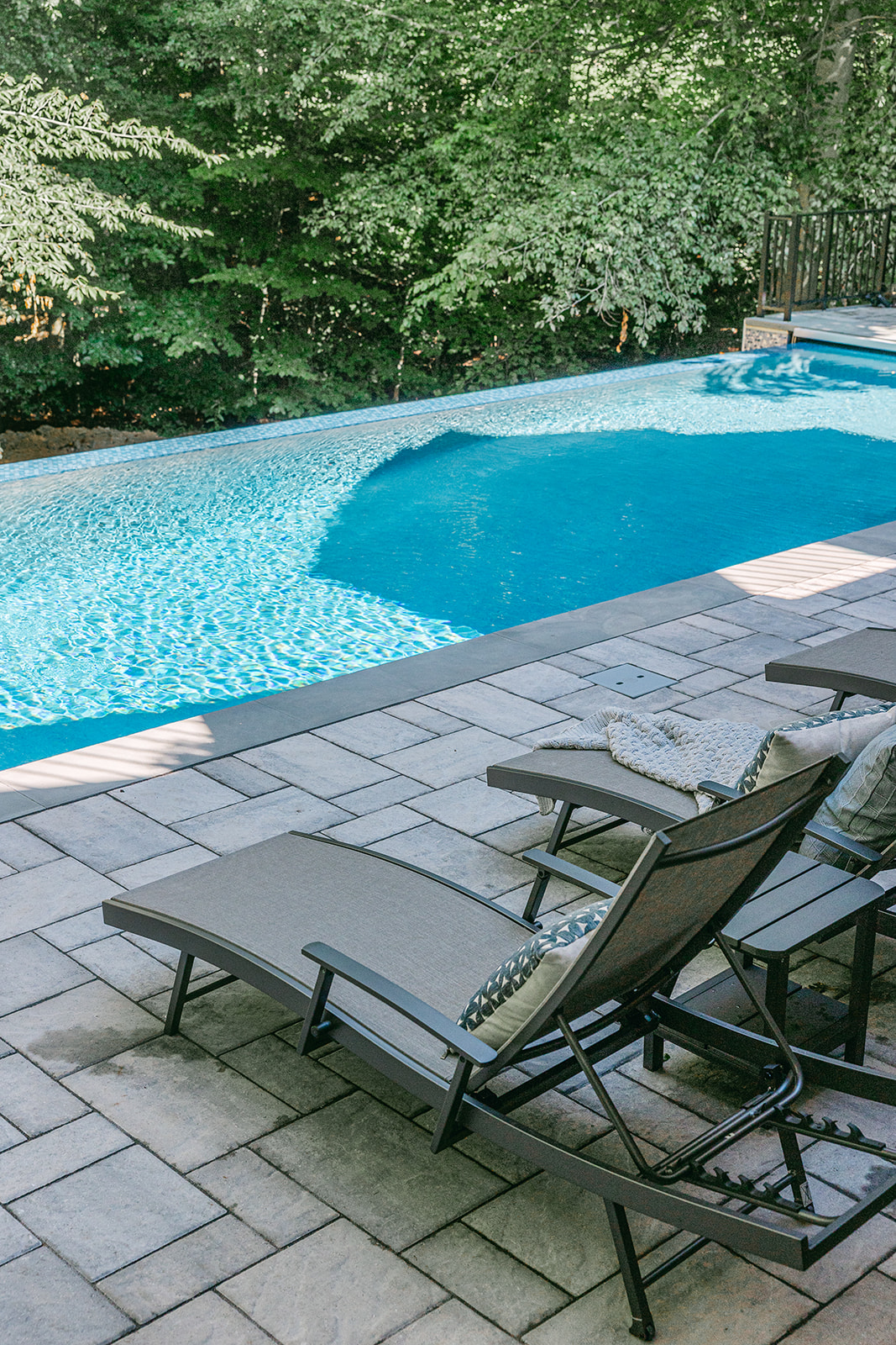 Surrounding the pool is an expansive Techo-Bloc Blu 60 patio and pool deck in Shale Grey with an Onyx border, a favorite of the Outdoor Dreams team for its clean lines, slip resistance, and refined modern texture. The thermaled bluestone coping with squared edges completes the look—simple, elegant, and timeless.