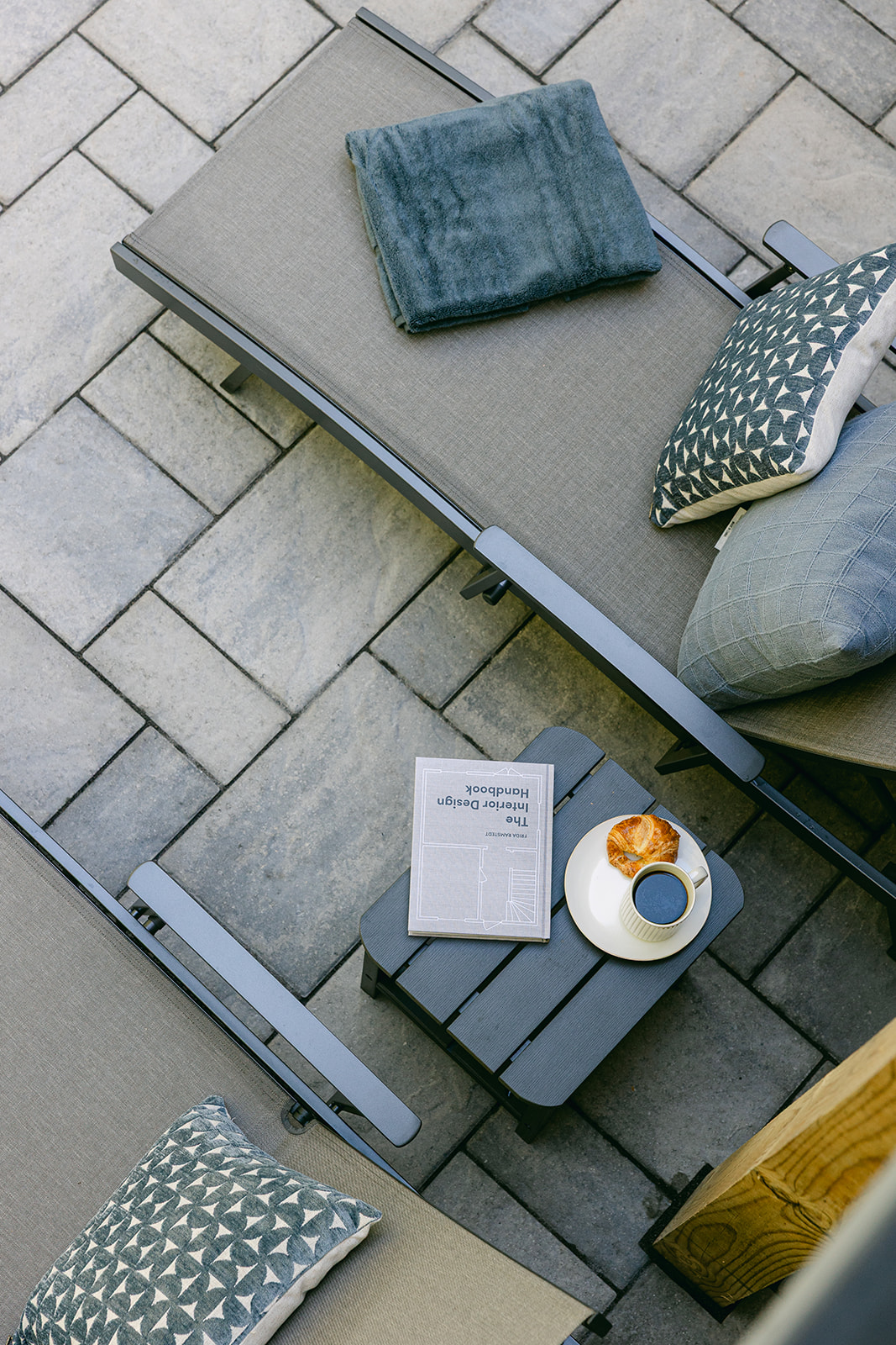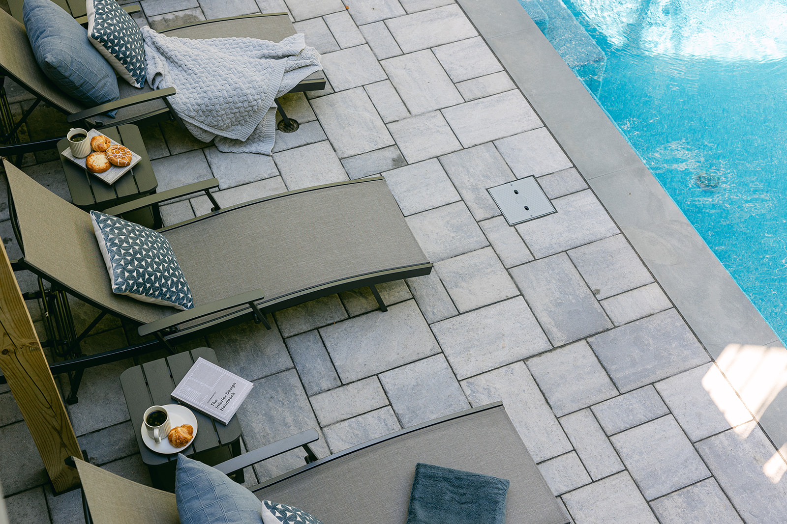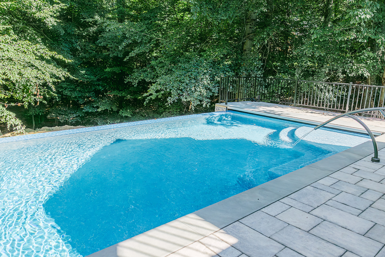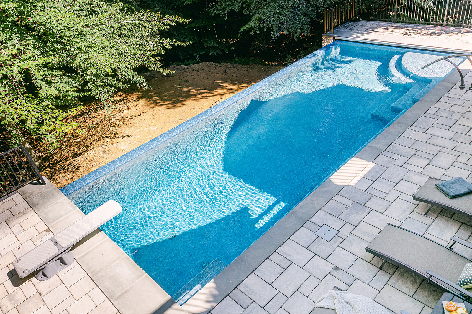 Surrounding the pool is an expansive Techo-Bloc Blu 60 patio and pool deck in Shale Grey with an Onyx border, a favorite of the Outdoor Dreams team for its clean lines, slip resistance, and refined modern texture. The thermaled bluestone coping with squared edges completes the look—simple, elegant, and timeless.