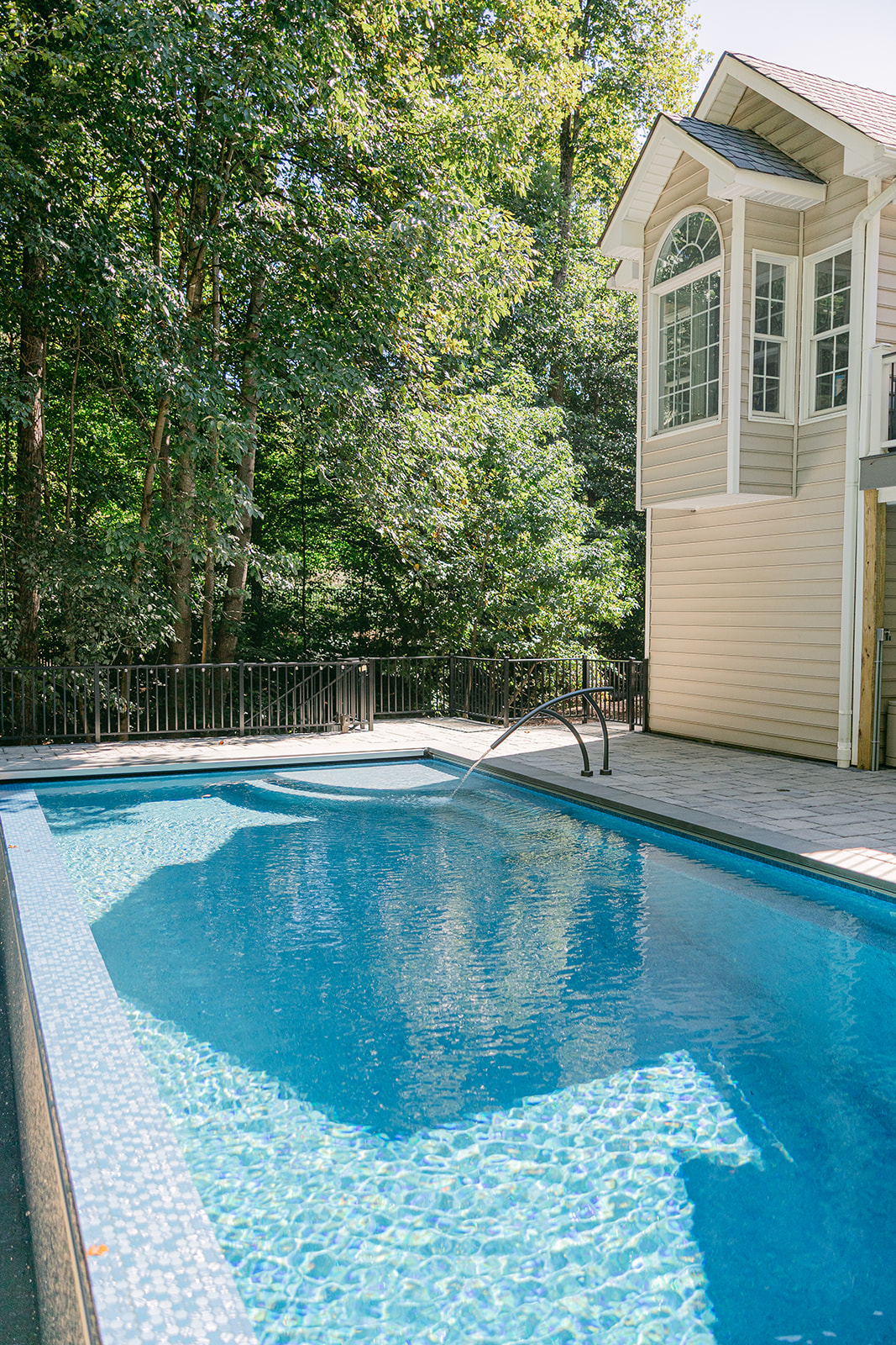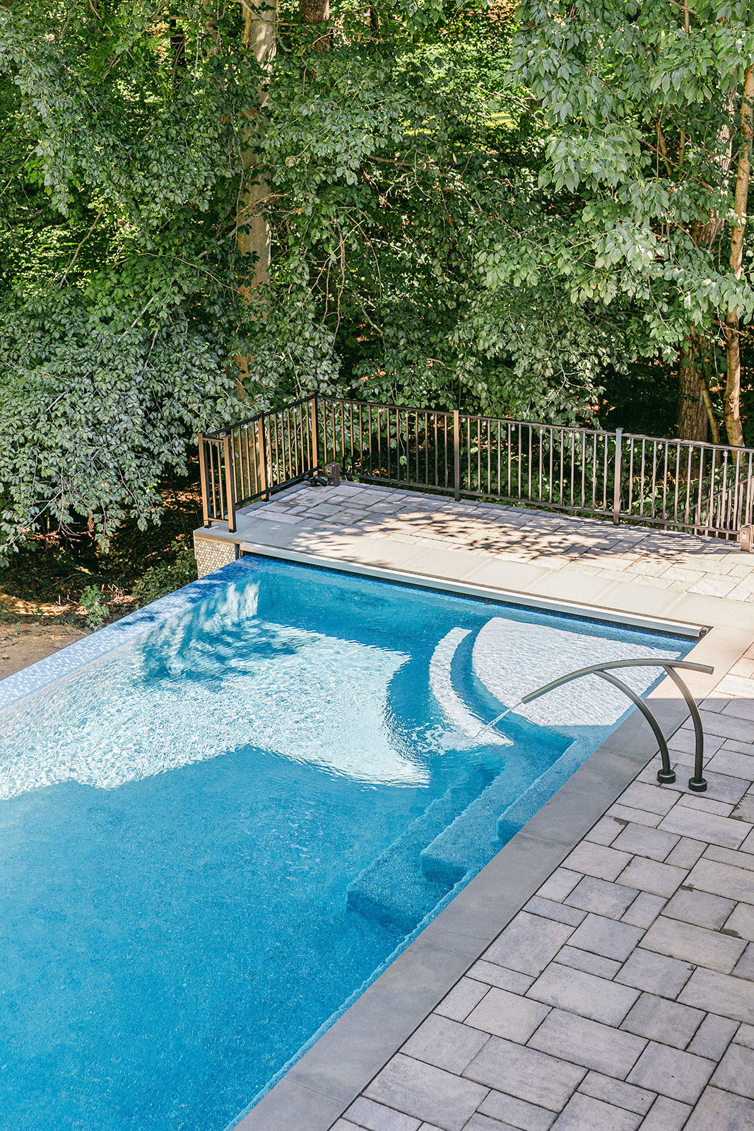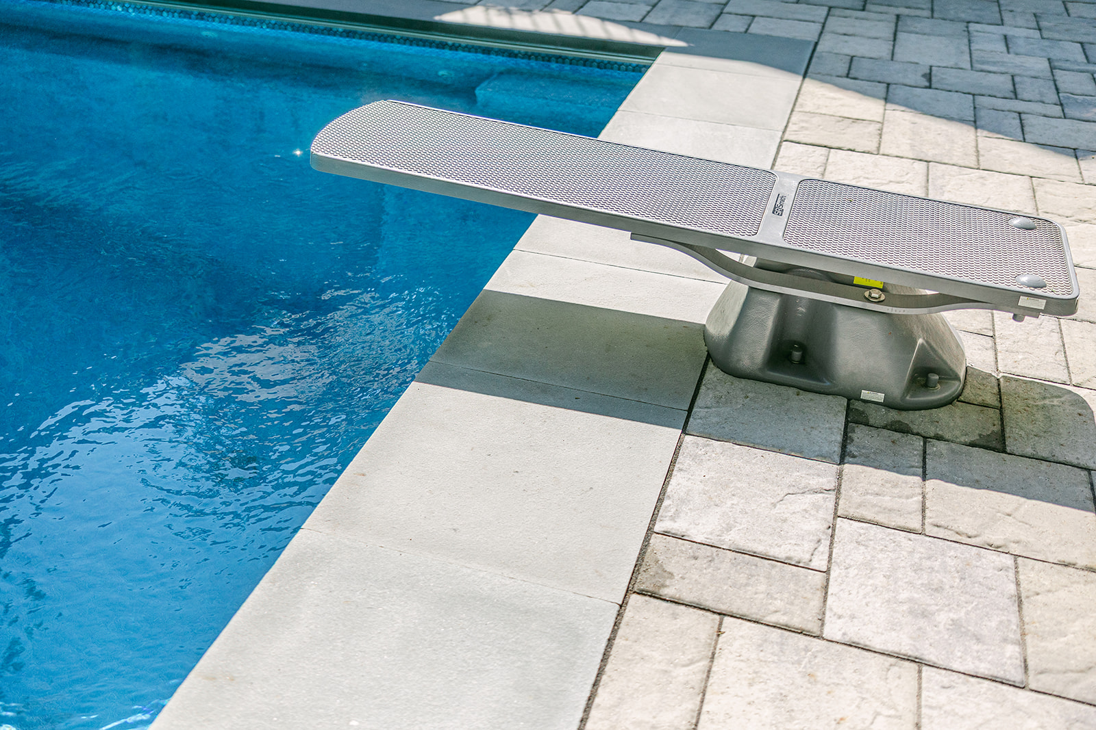 The pool was designed for both recreation and relaxation, featuring a dive-safe well paired with a diving board from SR Smith and a custom water-cooled handrail that connects directly to the pool’s plumbing system. By circulating water through the rail, it stays cool even on the hottest summer days—ensuring both comfort and safety.