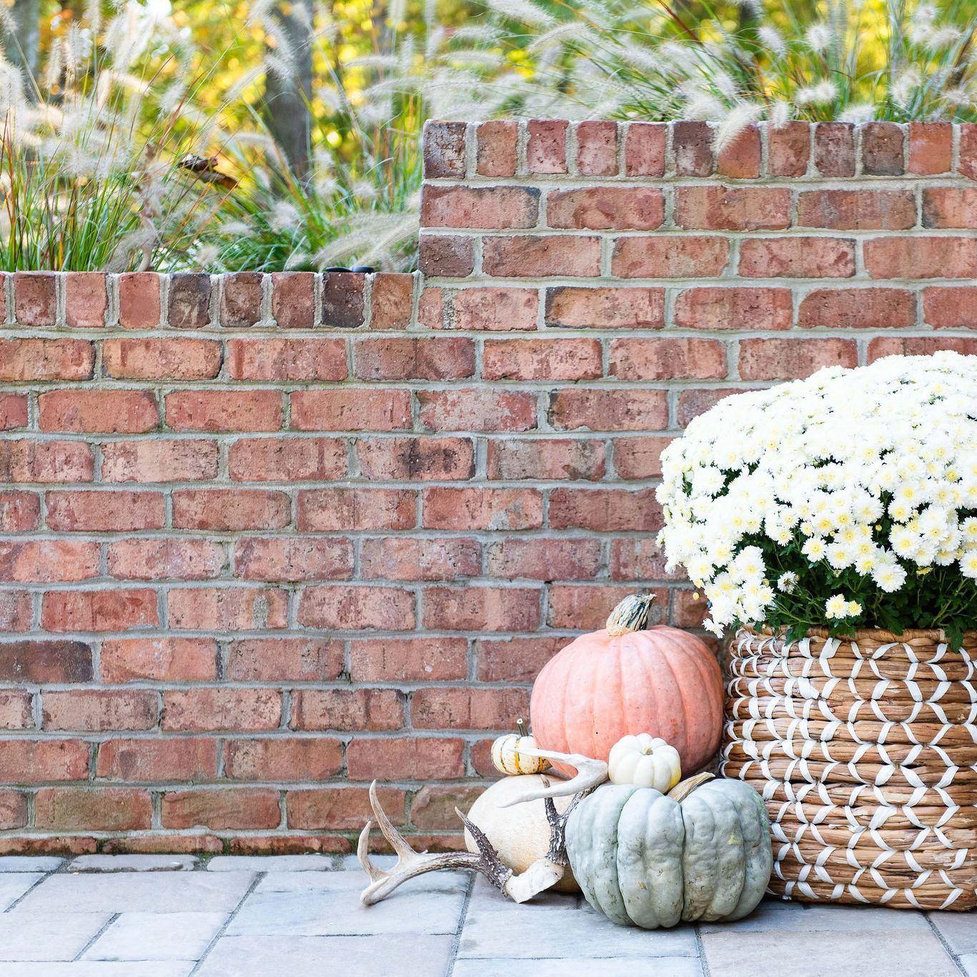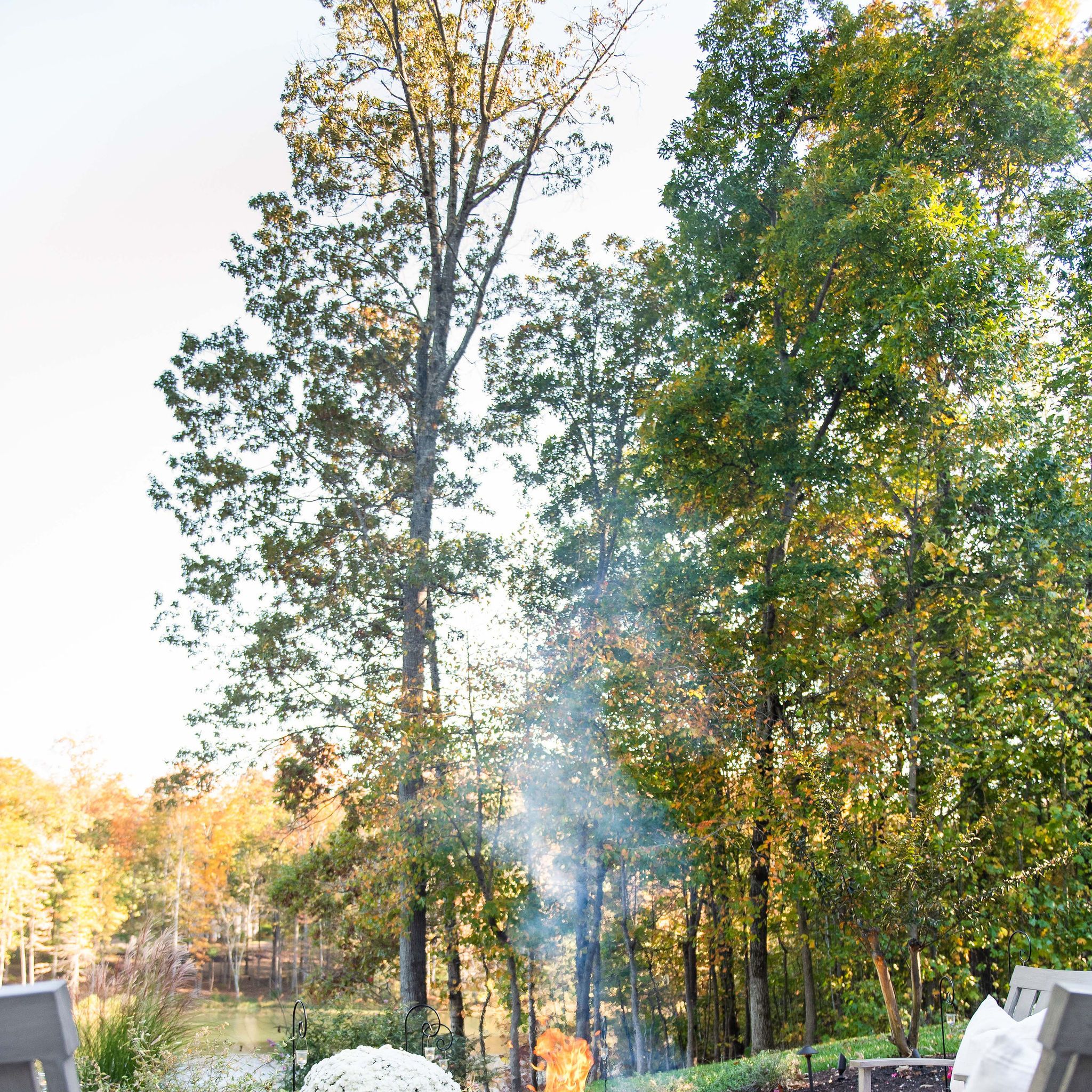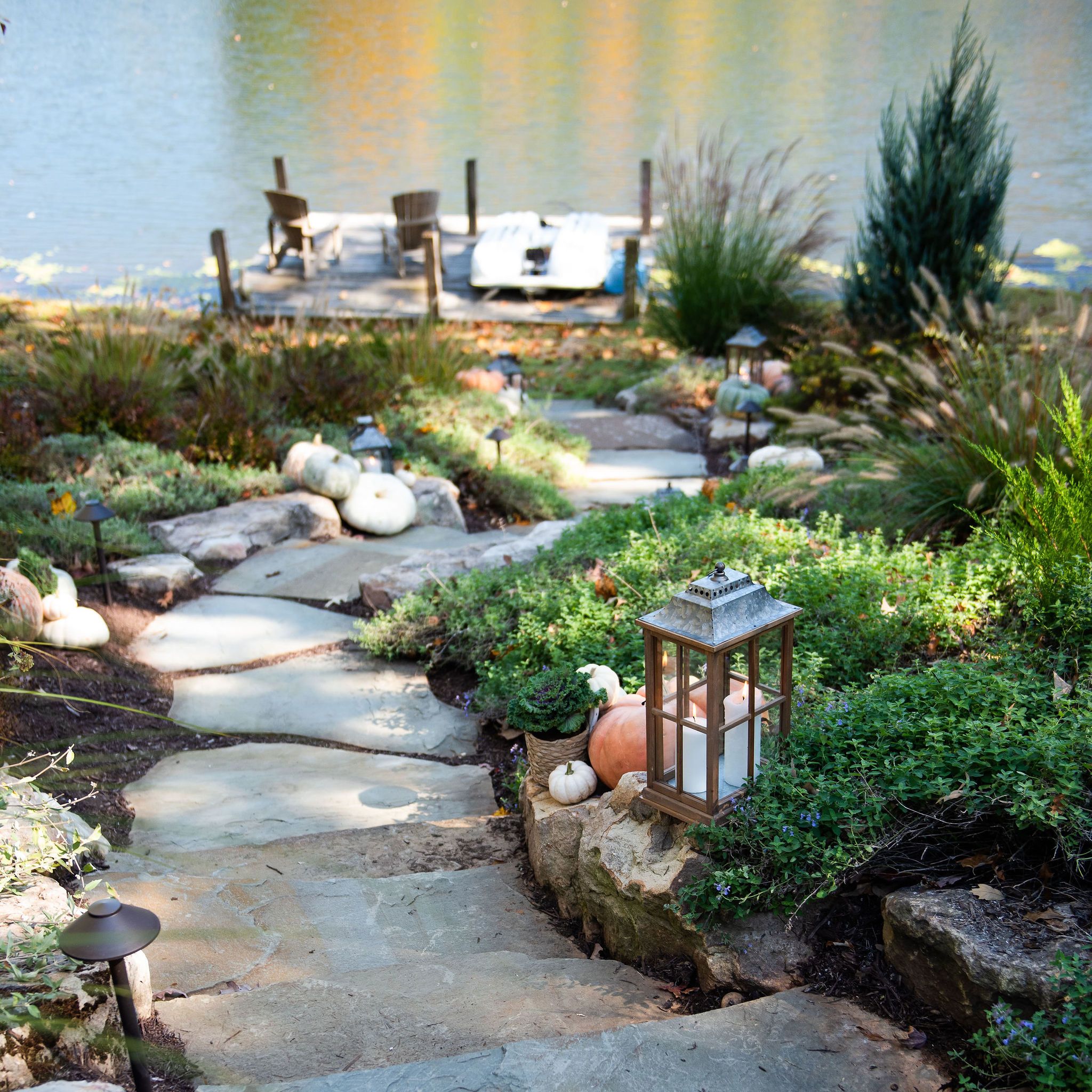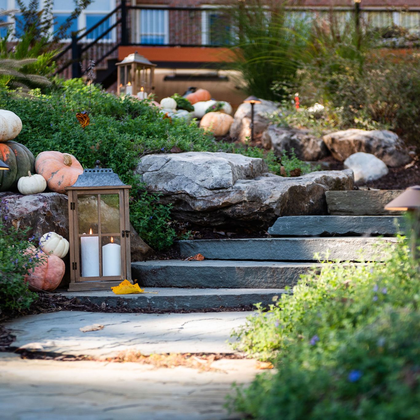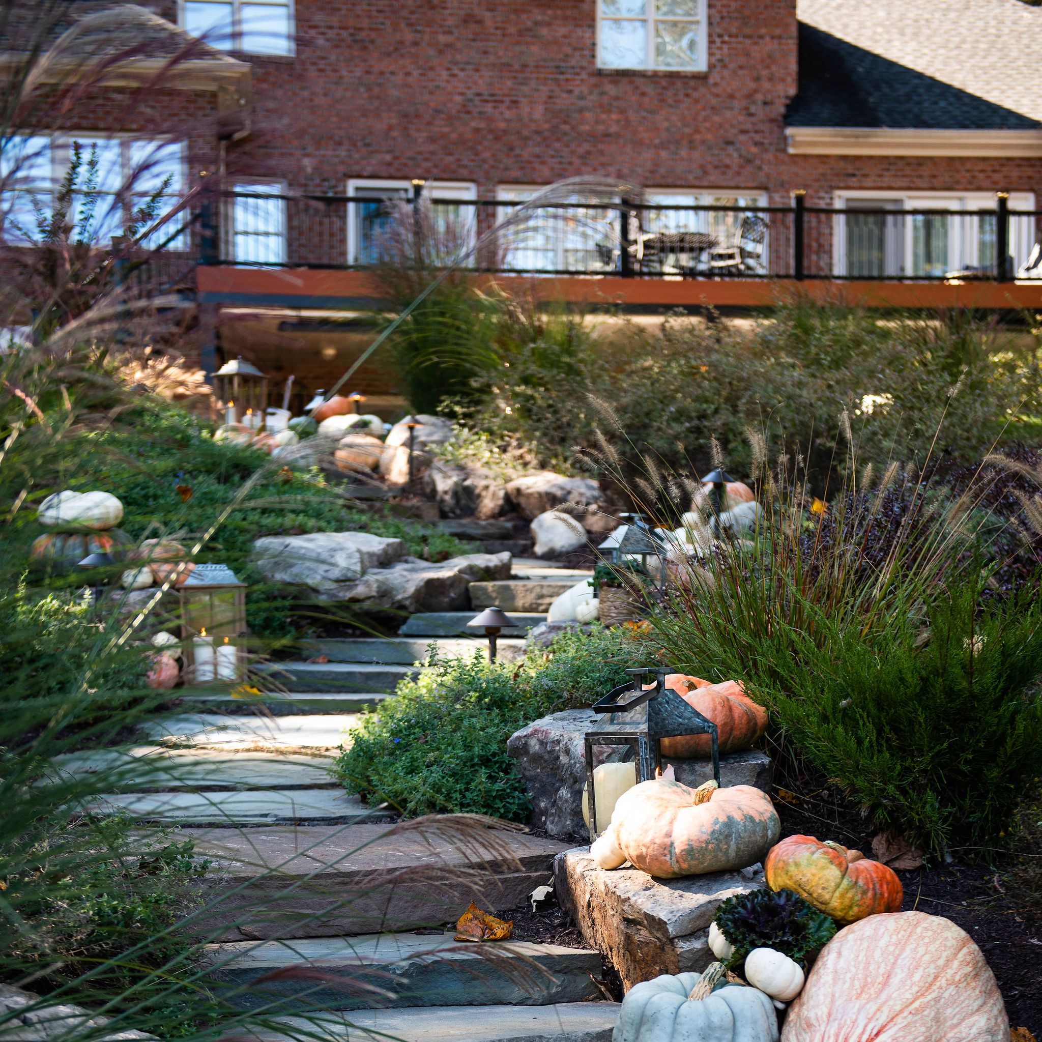 The walkway and patio are surrounded by a landscape designed to be deer-resistant and outdoor lighting that provides safety and ambiance after the sun goes down.