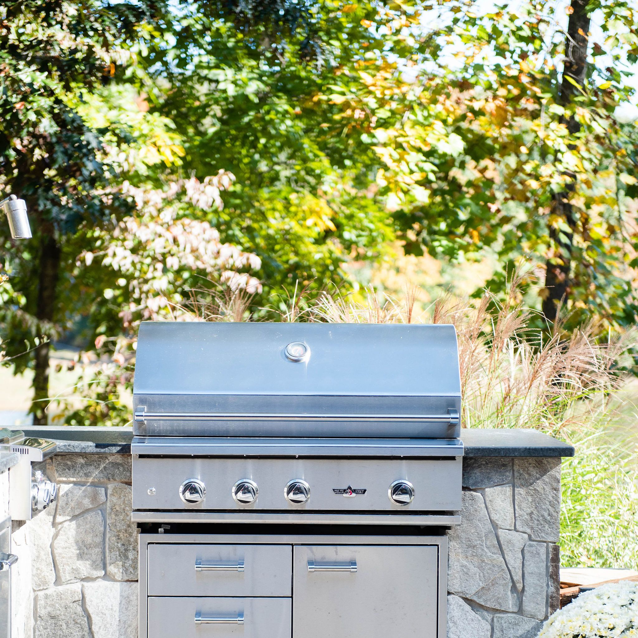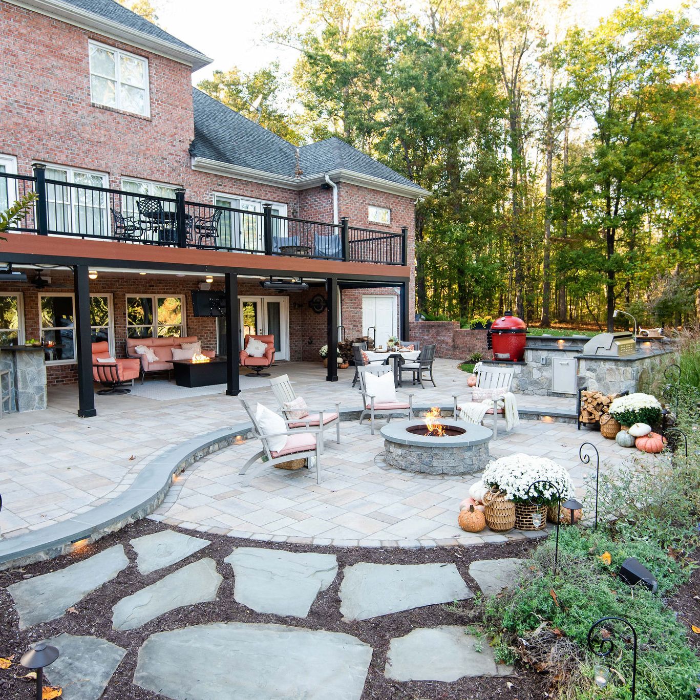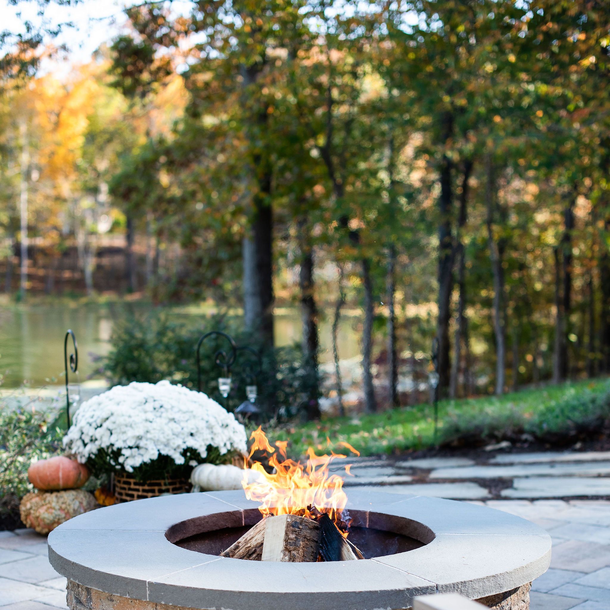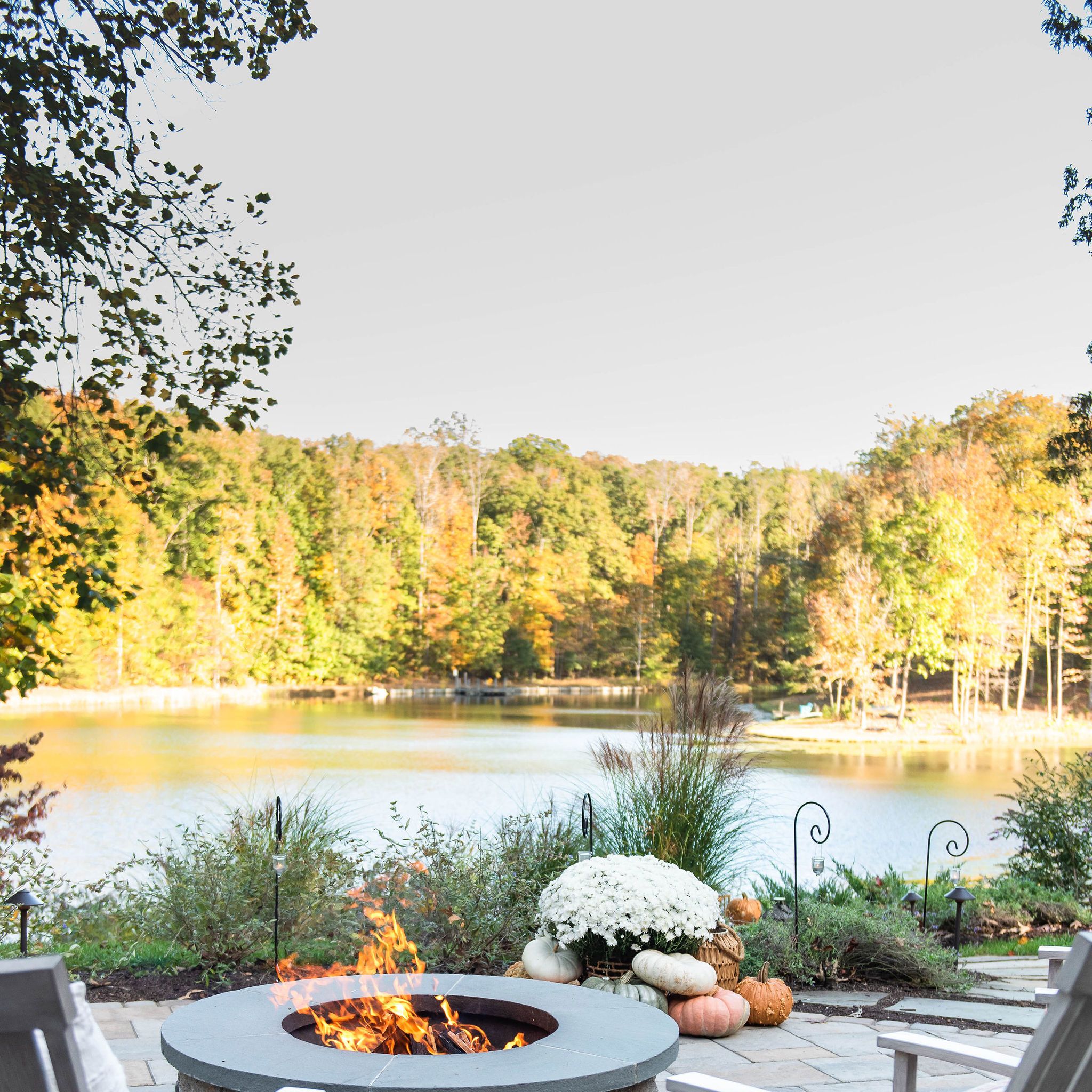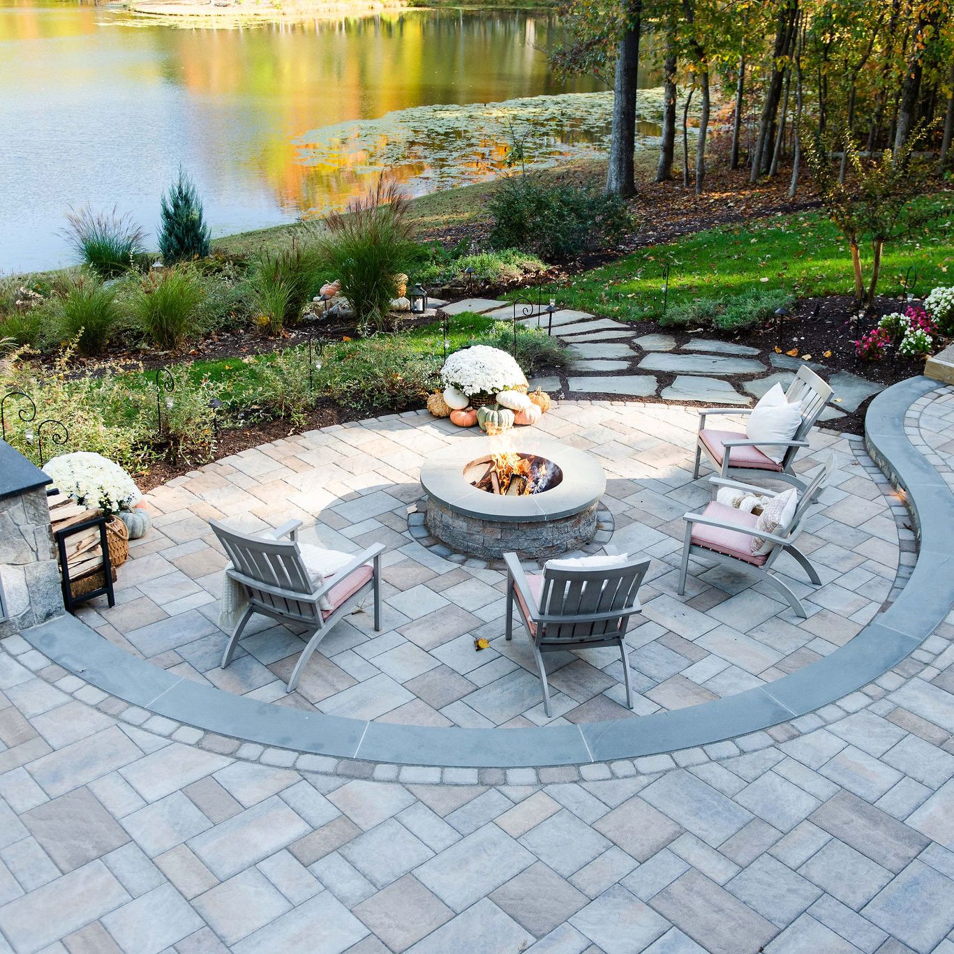 This stunning lake-view patio includes a fire pit, outdoor kitchen, and wet bar. The paver patio is composed of BLU 60 slabs and Villagio pavers from Techo-Bloc in a color blend of Champlain Grey and Chestnut Brown. The Outdoor Kitchen features a grill and side burner from Delta Heat as well as a smoker from Kamado Joe. The kitchen also includes bar-top seating for four.