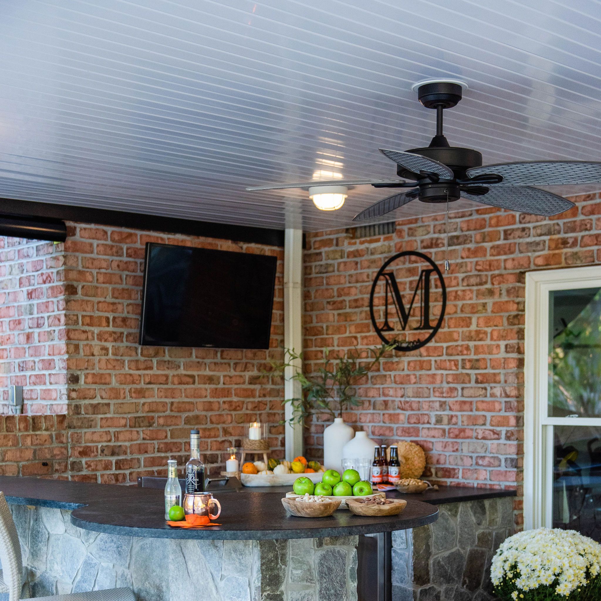 We also finished off the area under the deck with a drainage and ceiling system, lights, fans, two outdoor televisions, heaters, and a wet bar area. The wet bar includes an outdoor refrigerator, multiple storage areas, and bar-top seating for 8. The wet bar and outdoor kitchen structures are both composed of Chocolate Grey thin stone veneer and topped with leathered granite from Classic Granite and Marble.