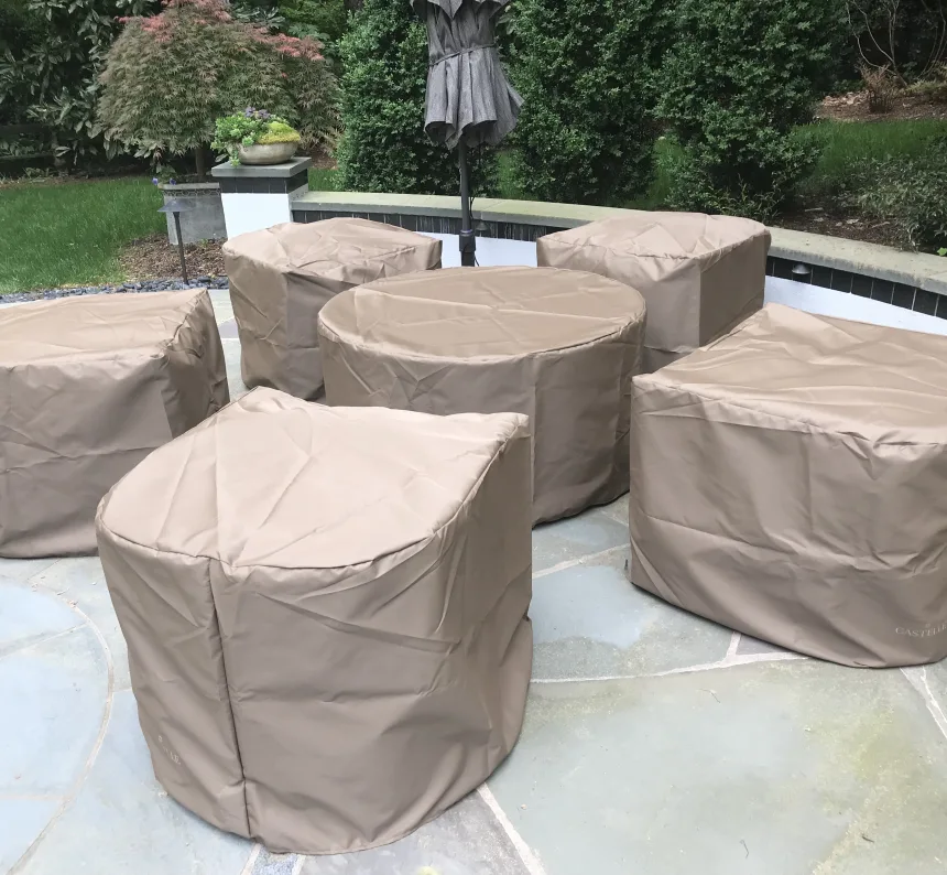 When gathering around a snow day fire, you'll want a dry place to sit. If you don't have furniture covers, you can pull seats together and cover them with a tarp. Or, if you haven't already, simply bring the cushions indoors.