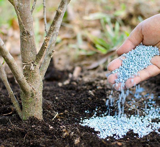 Once the ground thaws, apply granular fertilizer around the trees, shrubs, and perennials. Match the particular product to the plant type and to any particular nutrient needs spelled out by a soil test.