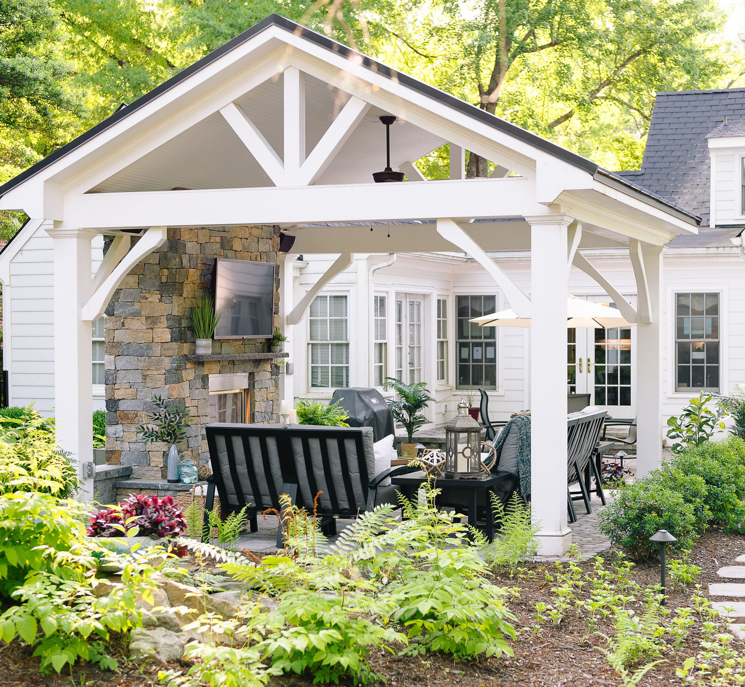 The pavilion-covered patio and fireplace was the driving force behind the project. Fans of multiple sports, the clients wanted a unique space where they could sit and enjoy a game, no matter the sport or season.