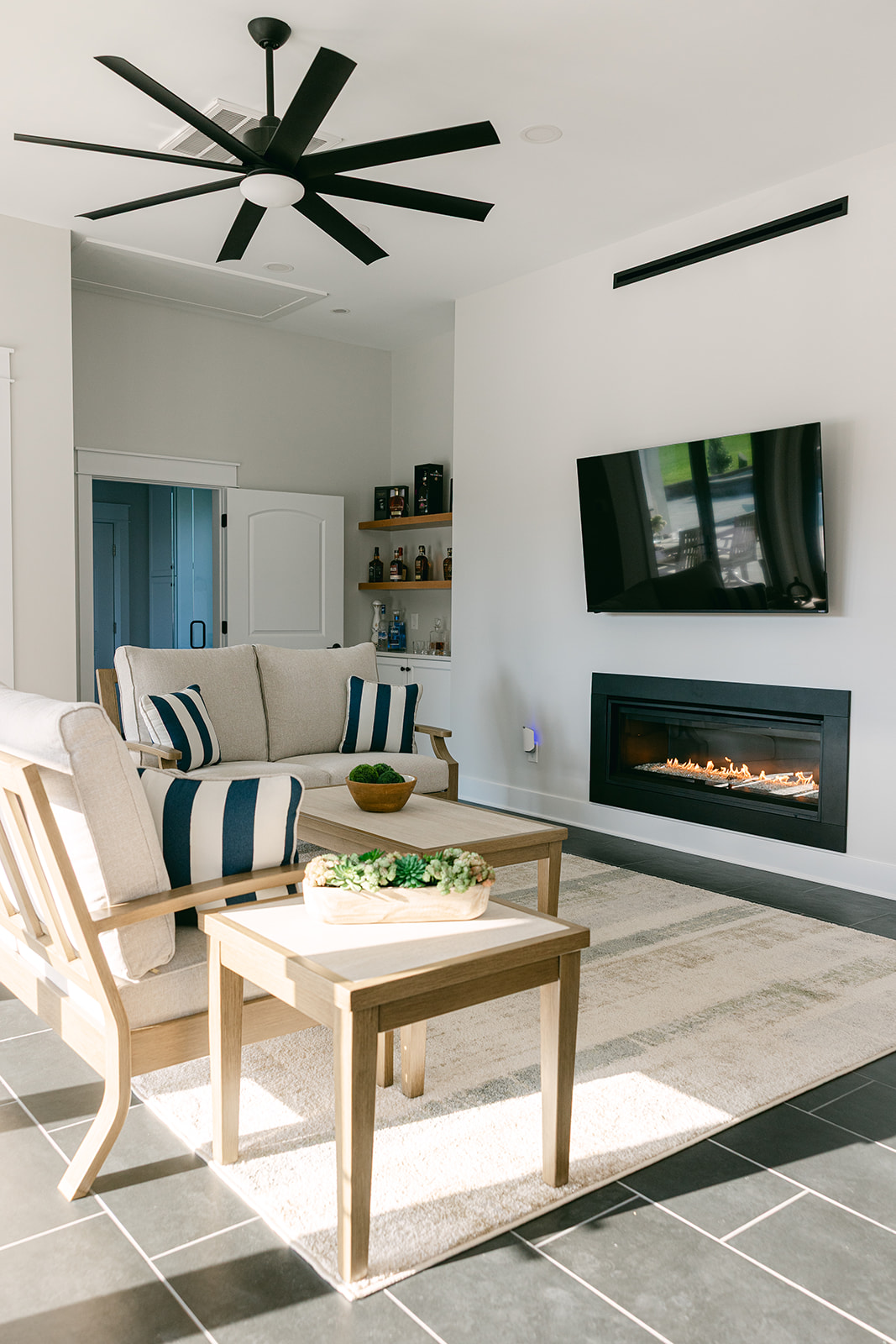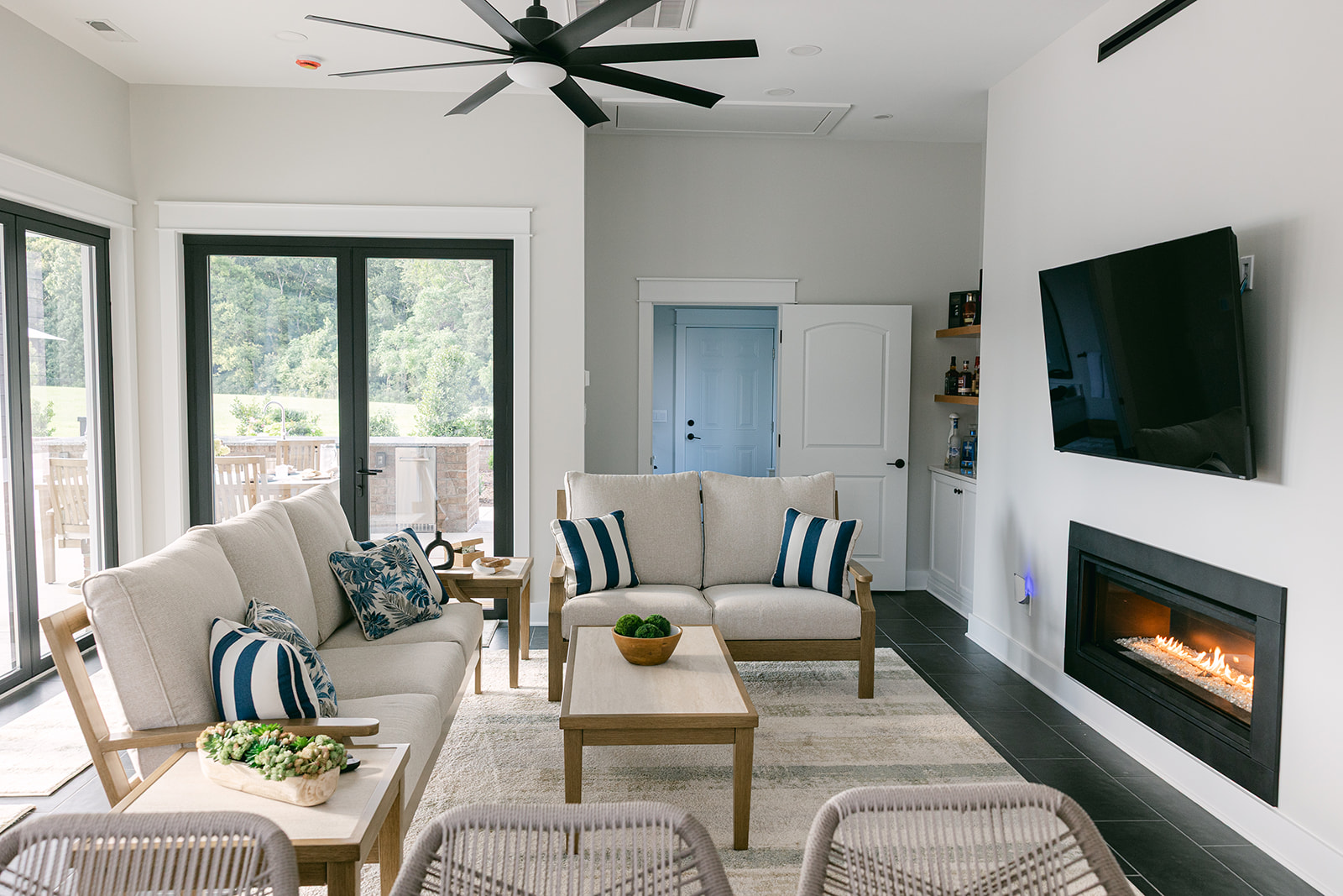 The living room was designed as a cozy, all-season escape. A gas fireplace anchors the space beneath a wall-mounted television, making it perfect for everything from movie nights to warming up after a winter swim.