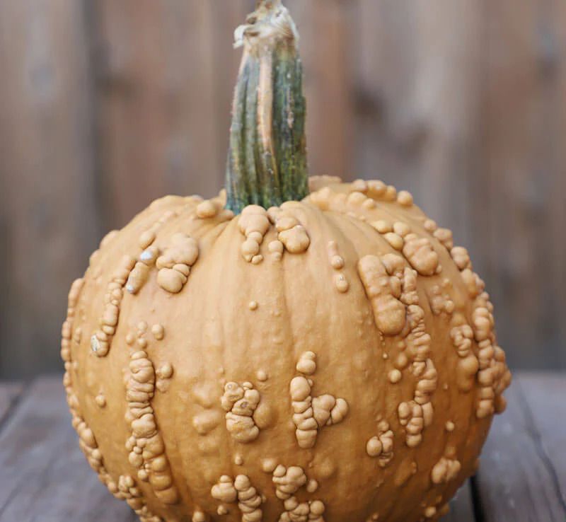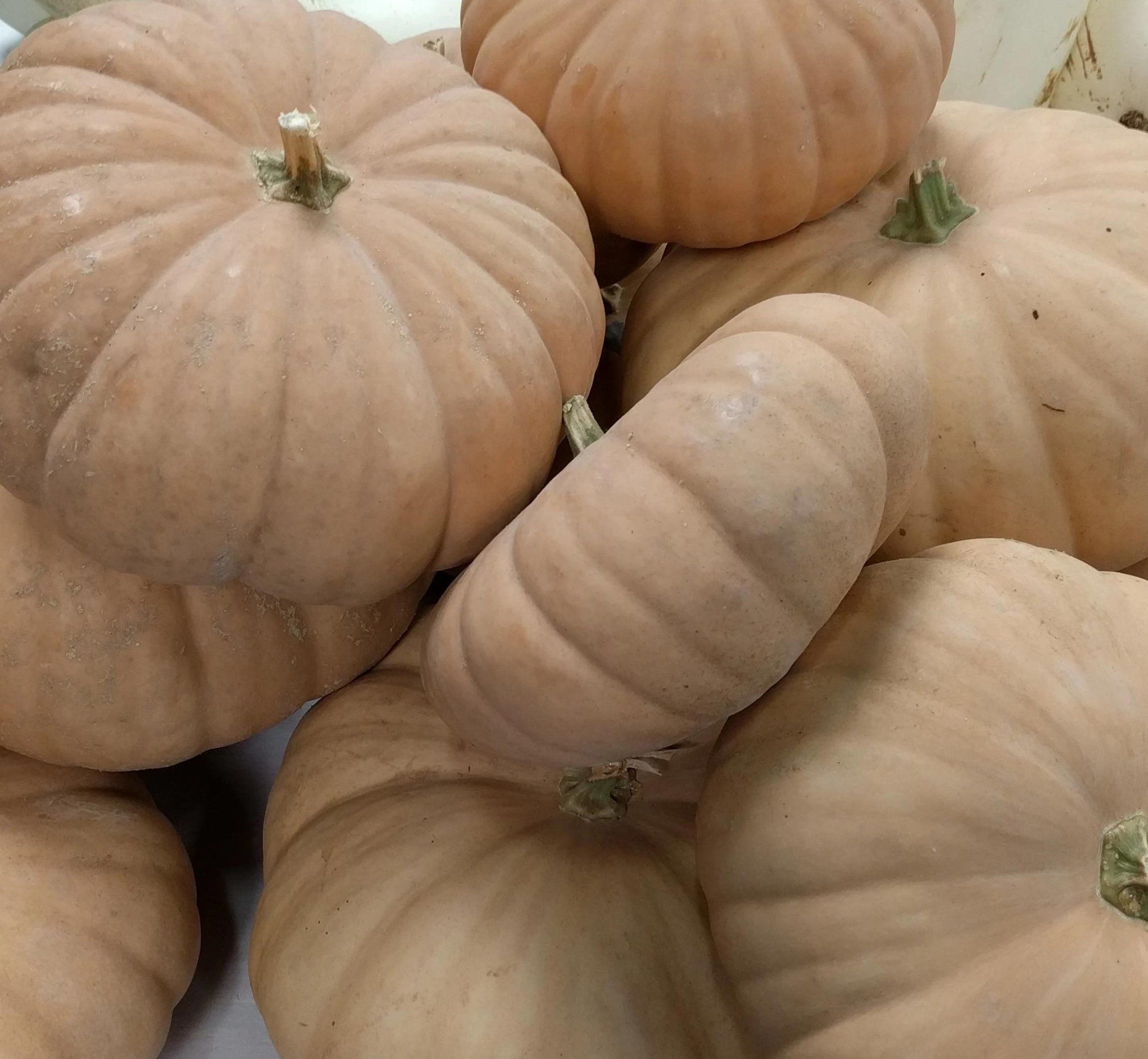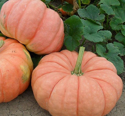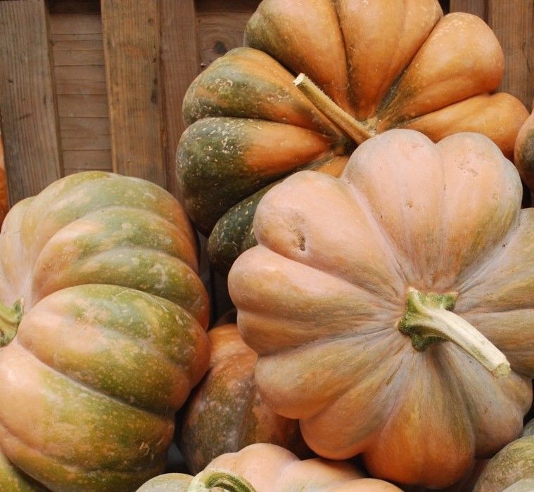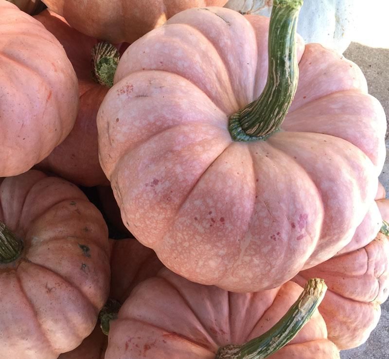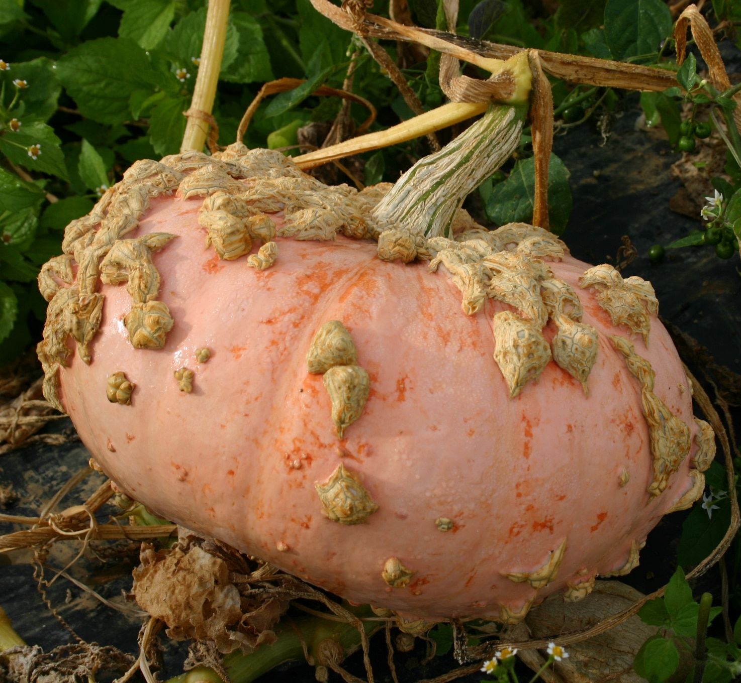 This gorgeous French heirloom produces a flattened globe with salmon-peach skin. The knobby bumps (resembling peanut shells) on this French heirloom are caused by a buildup of sugar beneath the skin. These warty pumpkins look awesome in displays, lending character that other pumpkins lack. This variety is also delicious in pies and soups because the flesh is sweet and not stringy.