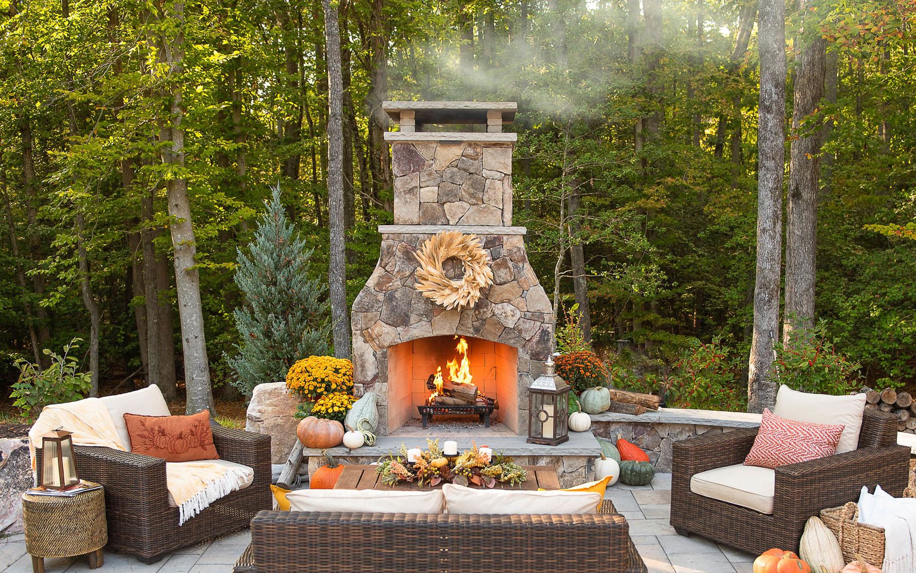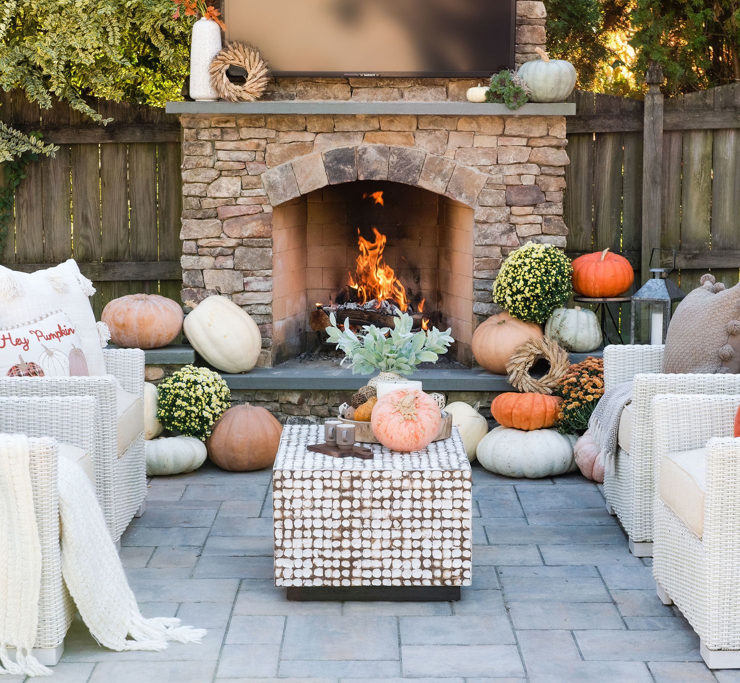 In this project we use pumpkins to decorate an outdoor fireplace, outdoor kitchen, and stairway.