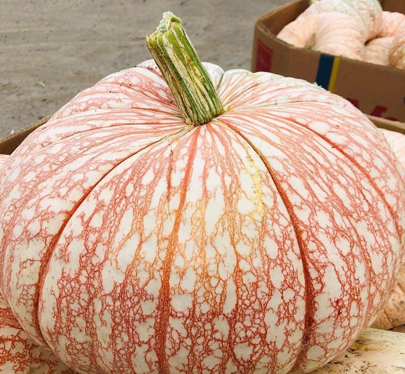 As the picture shows, these beauties offer stunning coloration. The mix of orange-pink and green-grey makes for a truly unique pumpkin.