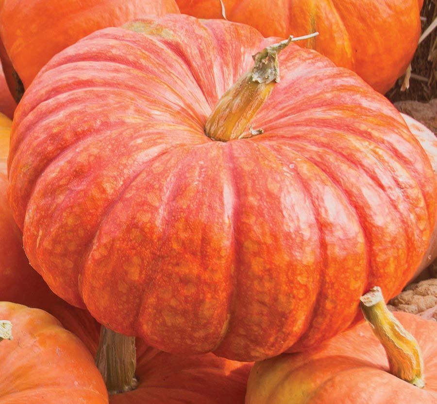 If you had a fairy godmother, she would turn this deep reddish-orange pumpkin into your coach. This classic heirloom was mentioned by famous French seed house, Vilmorin, as the most popular pumpkin in Parisian markets of the 1880s. Its French name translates to "Vivid red from Etampes," a nod to the medieval town just south of Paris where it was grown for market. The attractive shape and color make this a phenomenal decoration for autumn displays. This heirloom variety makes a beautiful display, especially with several stacked on top of each other. With its semi-sweet flavor and lovely hue, it is also a good choice for pies and is a standard for French soup stocks.