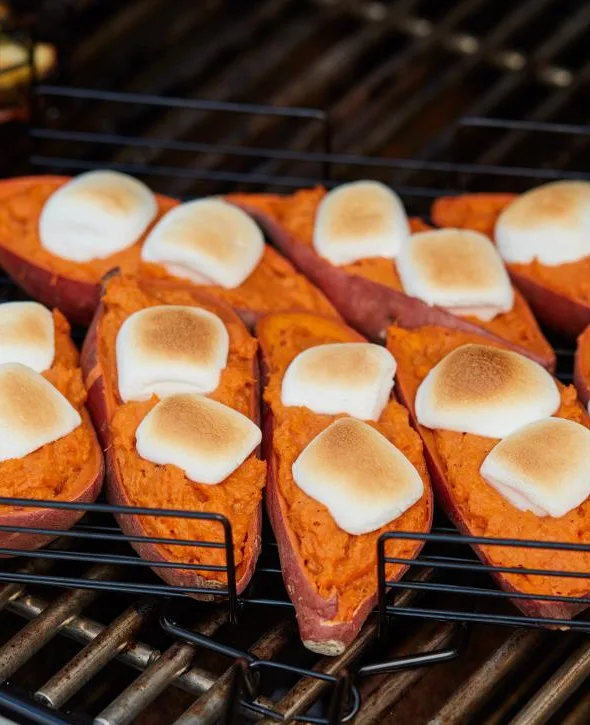 Pictured: These super-simple sweet potatoes were placed directly on the grill, whole, for about an hour. After being allowed to cool, they were cut in half, topped with marshmallows, and put back on the grill for 10 minutes.