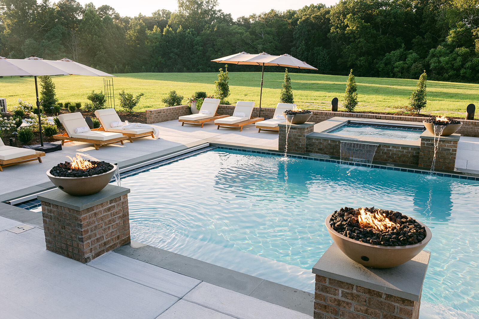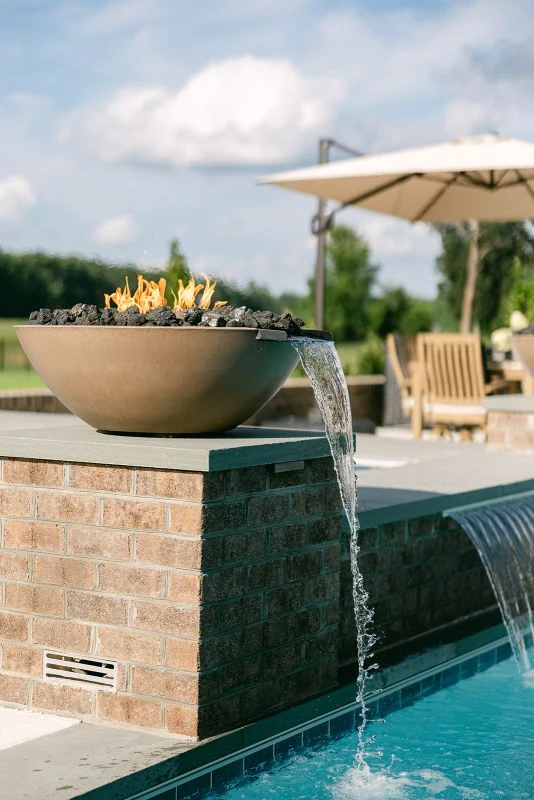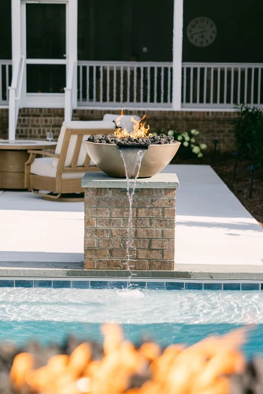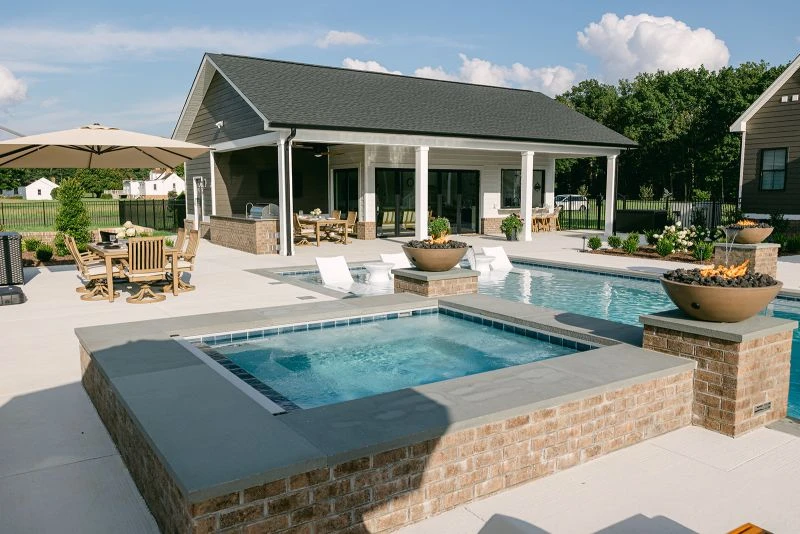 HARDSCAPE The patio and pool deck feature clean brushed concrete to match the home’s driveway and walkways, while the walls, pillars, and spa facade use brick to match the foundation. Thermaled bluestone treads are used for the pool and spa coping and pillar caps.