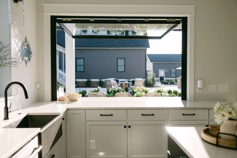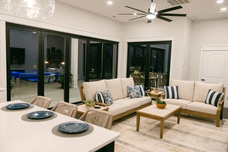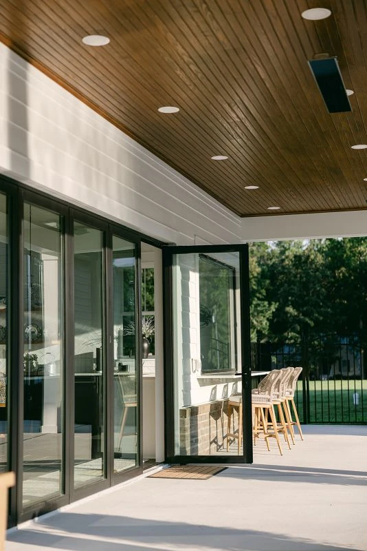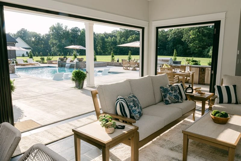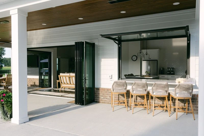 POOL HOUSE The pool house includes a full bath, kitchenette with pass-through bar, and a living room with a gas fireplace. To create an open feel and connect the interior to the pool area, collapsible glazed walls with integrated doors wrap the living space, while an automatic pull-up window transforms the pass-through bar into a stunning centerpiece.