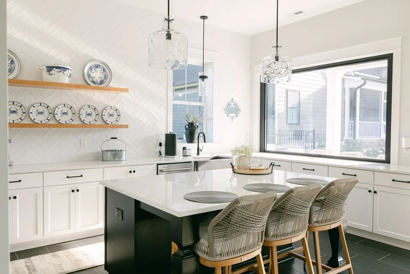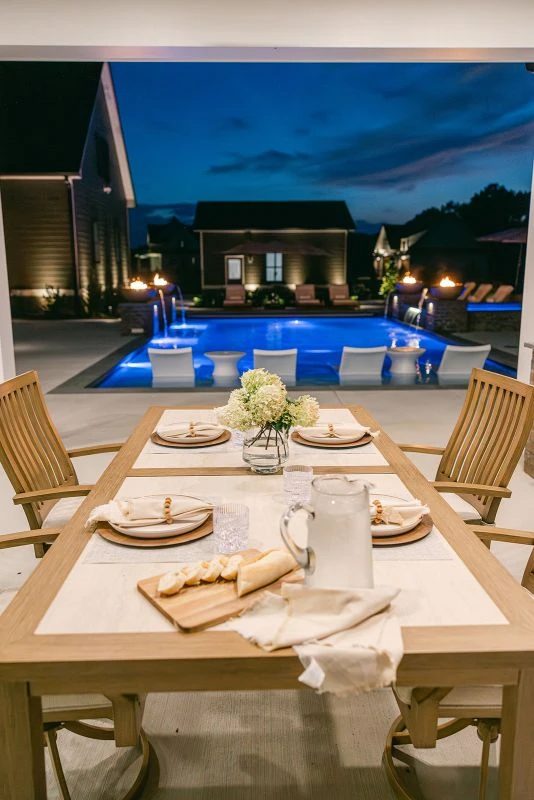 The design process moved quickly, unfolding in just two rounds of fully estimated drawings thanks to the homeowners’ clear vision for layout and budget. With most materials selected to match the home’s exterior, the design focus centered on the pool plaster and tile, along with a few pool house finishes where the homeowners opted for a fresh departure from their interior palette.